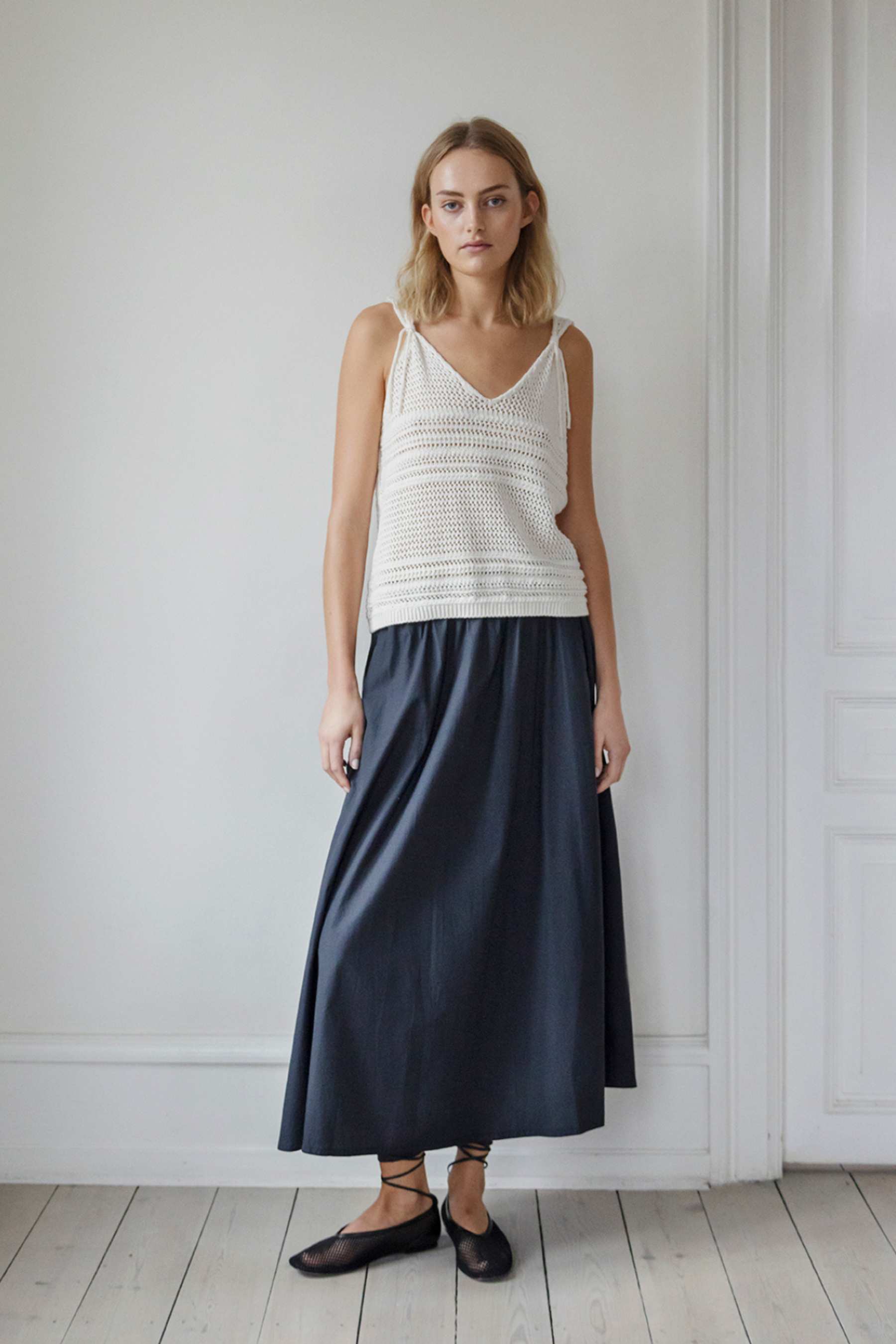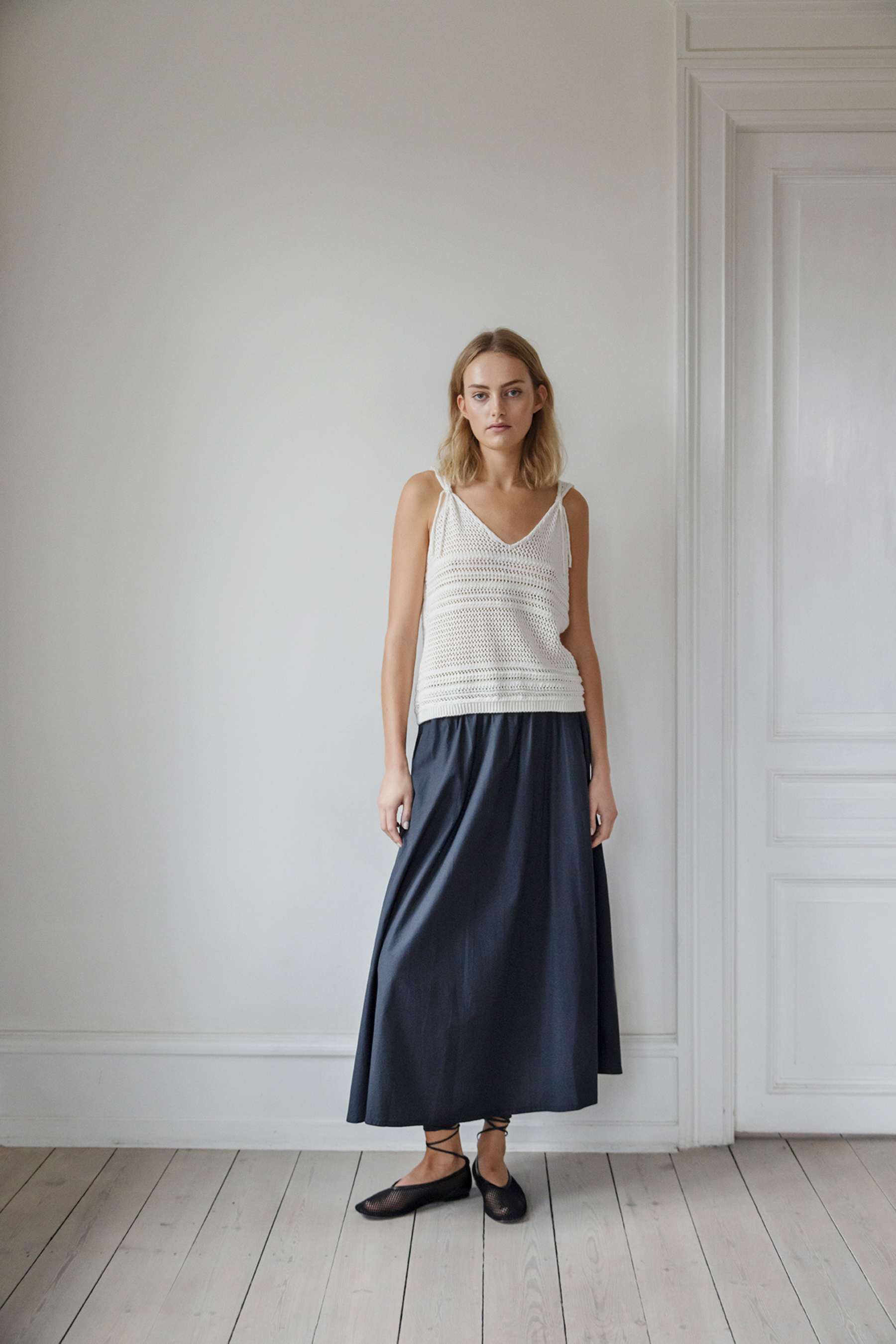 HAILEY is a midi length skirt with pockets and an elastic waist. The skirt is part of Project AJ117's basic collection made of 100% organic cotton.
