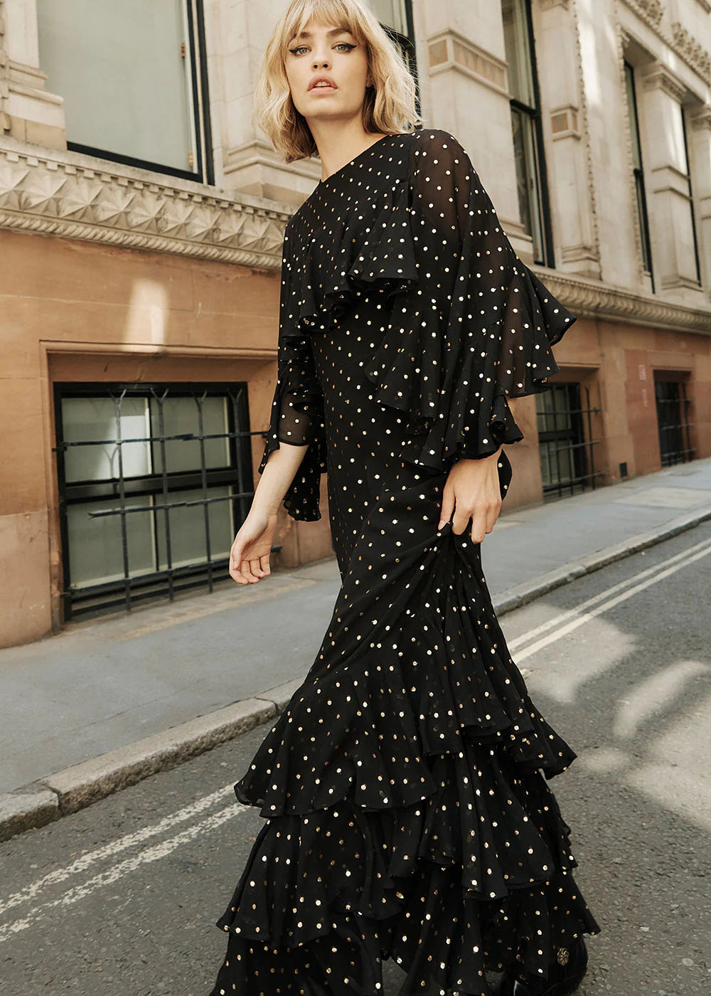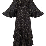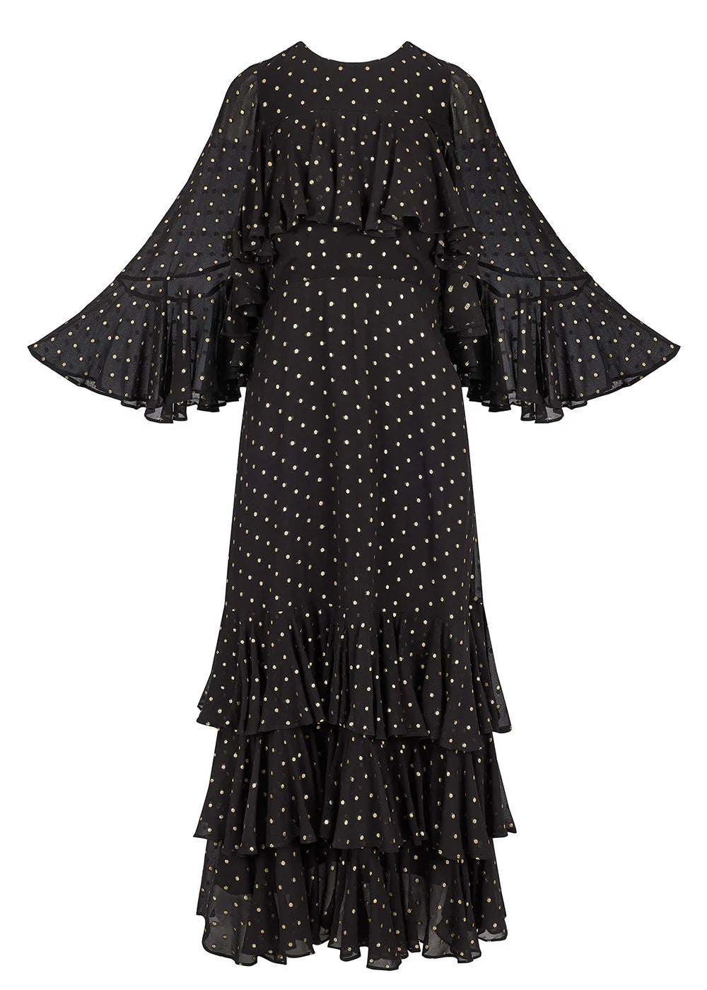 Petula is pure evening drama. A floor-sweeping silhouette in gauzy black chiffon, scattered with twinkling gold lurex polka dots that catch the light with every step. A soft cape overlay drapes over the shoulders, while the fluted sleeves and cascading ruffles create movement with cinematic flair.