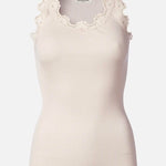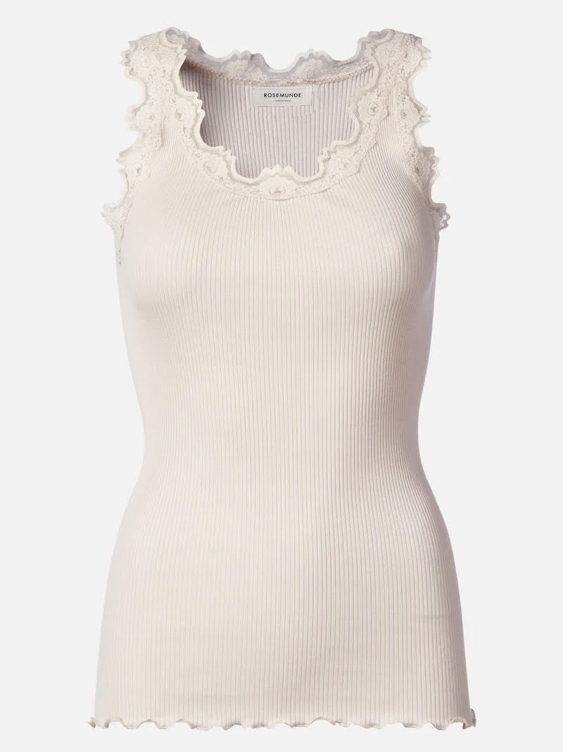 The classic silk top from Rosemunde features laces along the round neckline and a curl-edge on the bottom, which completes the feminine expression. The top is designed in a soft ribbed silk quality without side seams, making it incredibly comfortable to wear.