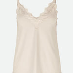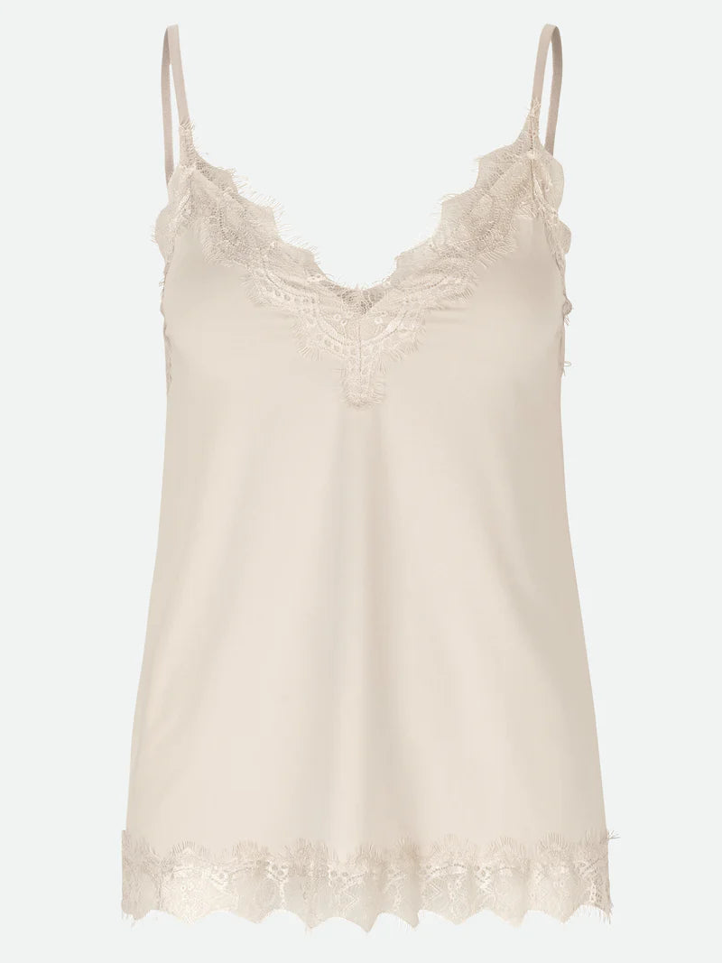 Lovely lace top with V-neck and adjustable straps. The popular top is designed with an elegant lace around the neckline and at the hem. The top is available in several colours and is easily styled. Wear it as it is or underneath a shirt or a blazer for a classy and feminine look.