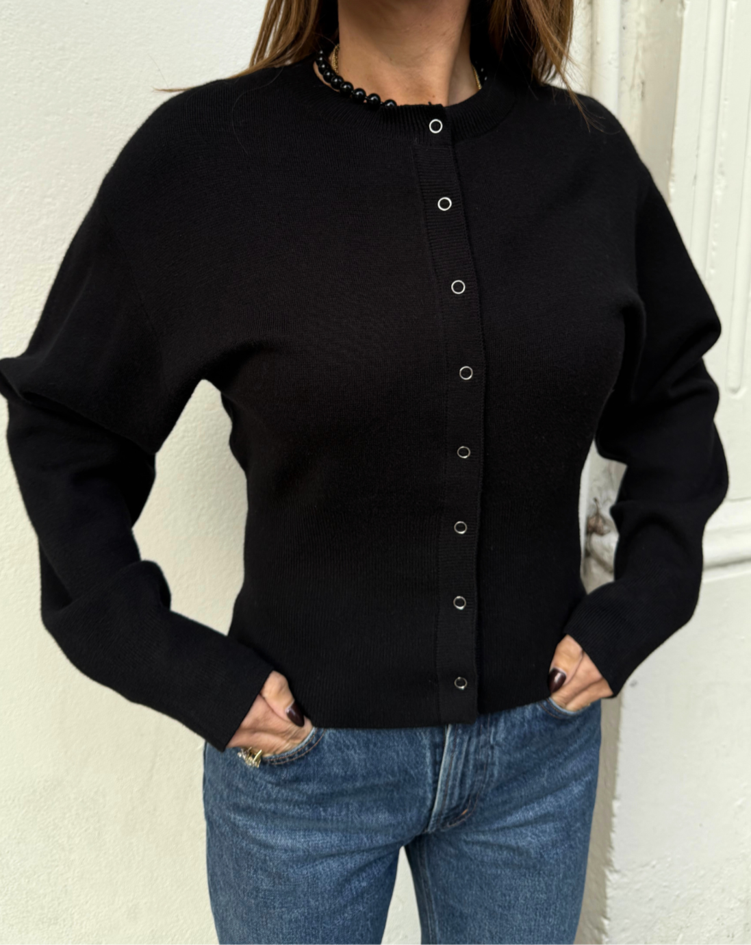 Gorgeous cardigan, softly knitted with ribbed, fitted bottom and loose upper going into the dropped shoulders and loose sleeves.