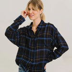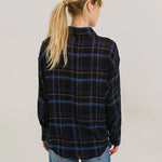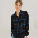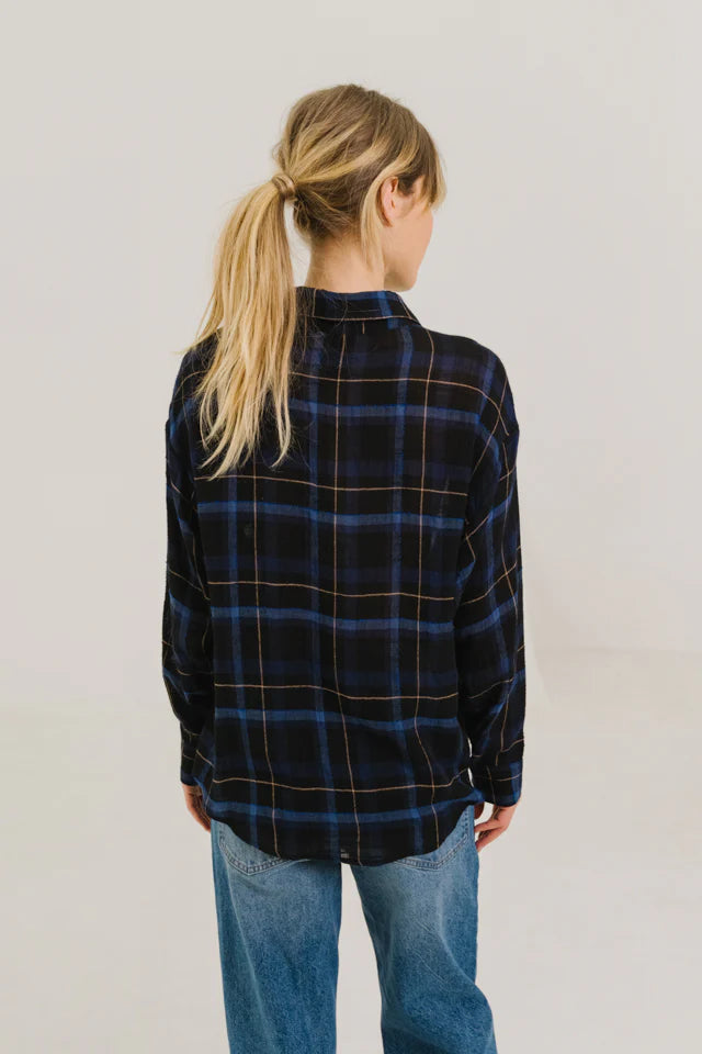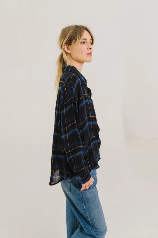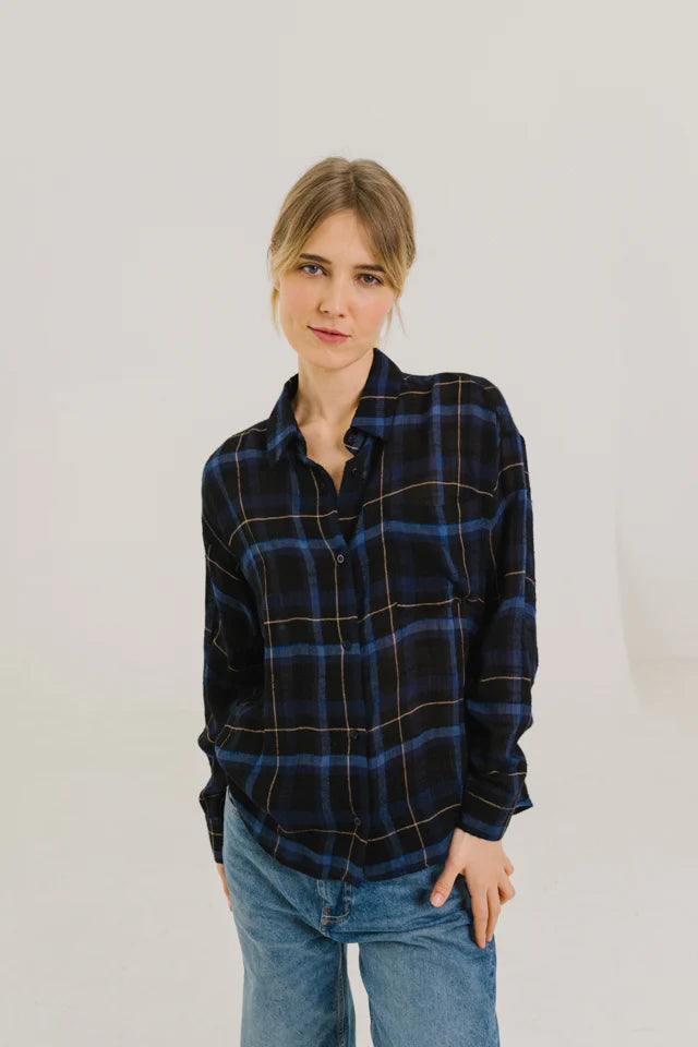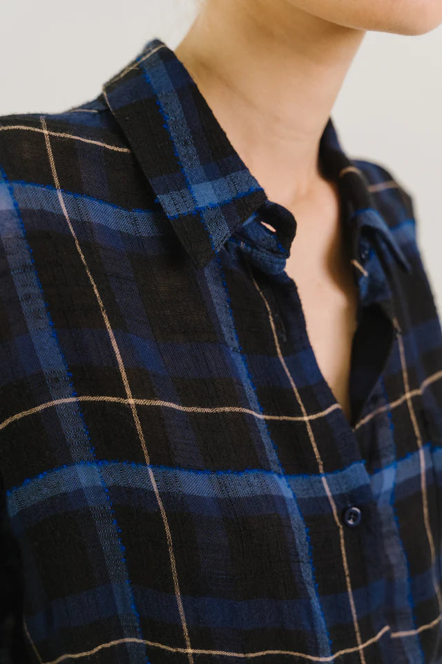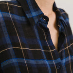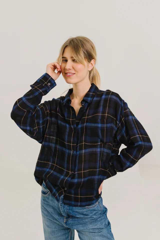 Black long-sleeved shirt with blue and beige checks, made from cotton and viscose. Inspired by a men's shirt, it features a slightly oversized cut with a dropped armhole for a relaxed silhouette. Its classic collar, chest patch pocket, and exposed buttoning give it a timeless touch. Buttoned cuffs finish.