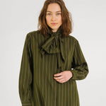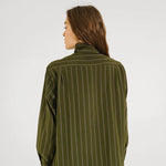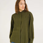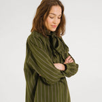 Long-sleeved blouse made of khaki viscose with pink stripes. Its oversized cut and low armhole offer a fluid and contemporary look. Equipped with a mandarin collar, it is distinguished by a removable collar, fixed by a discreet button in the back. Hidden buttoning, buttoned cuffs and back yoke complete this elegant and versatile piece.