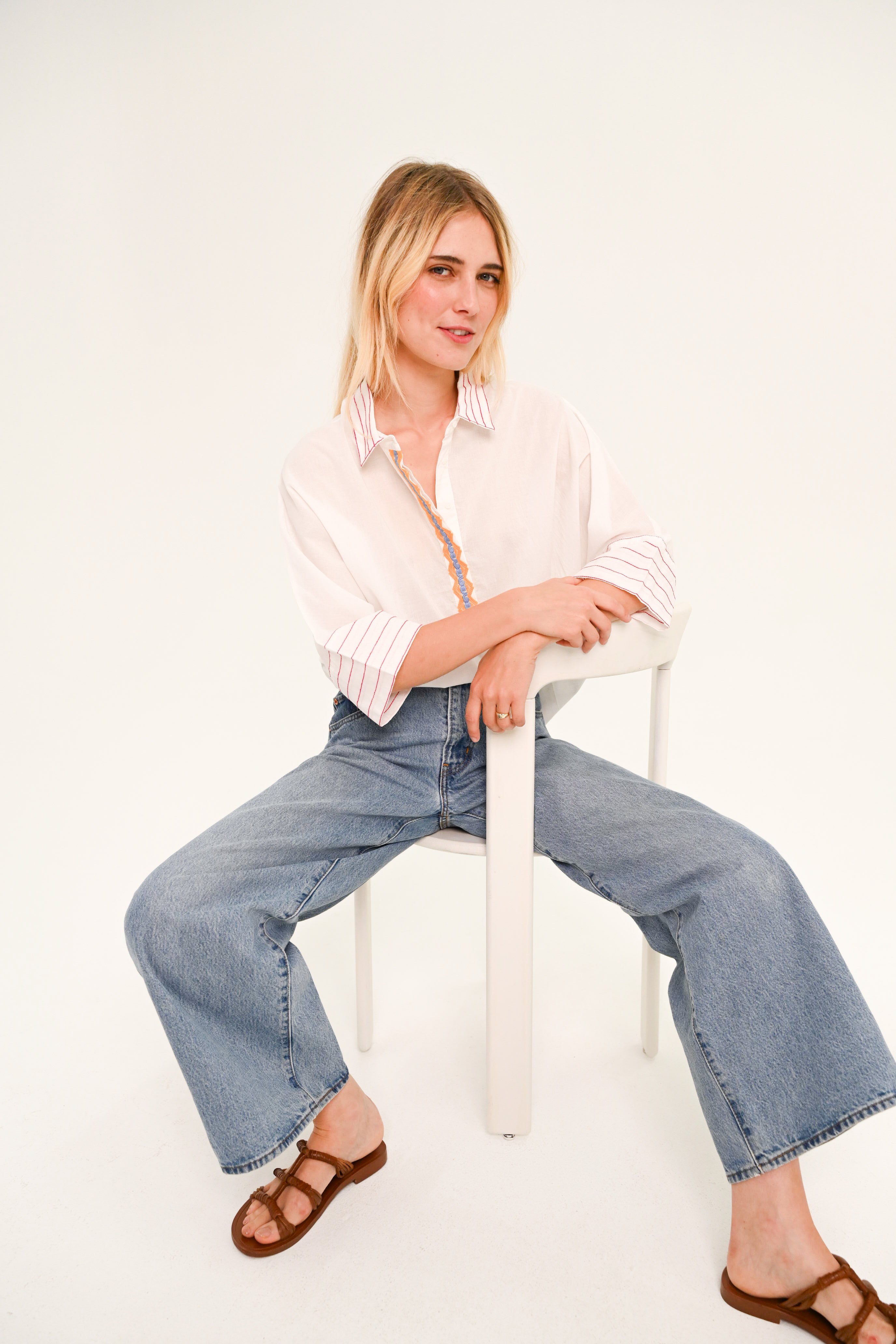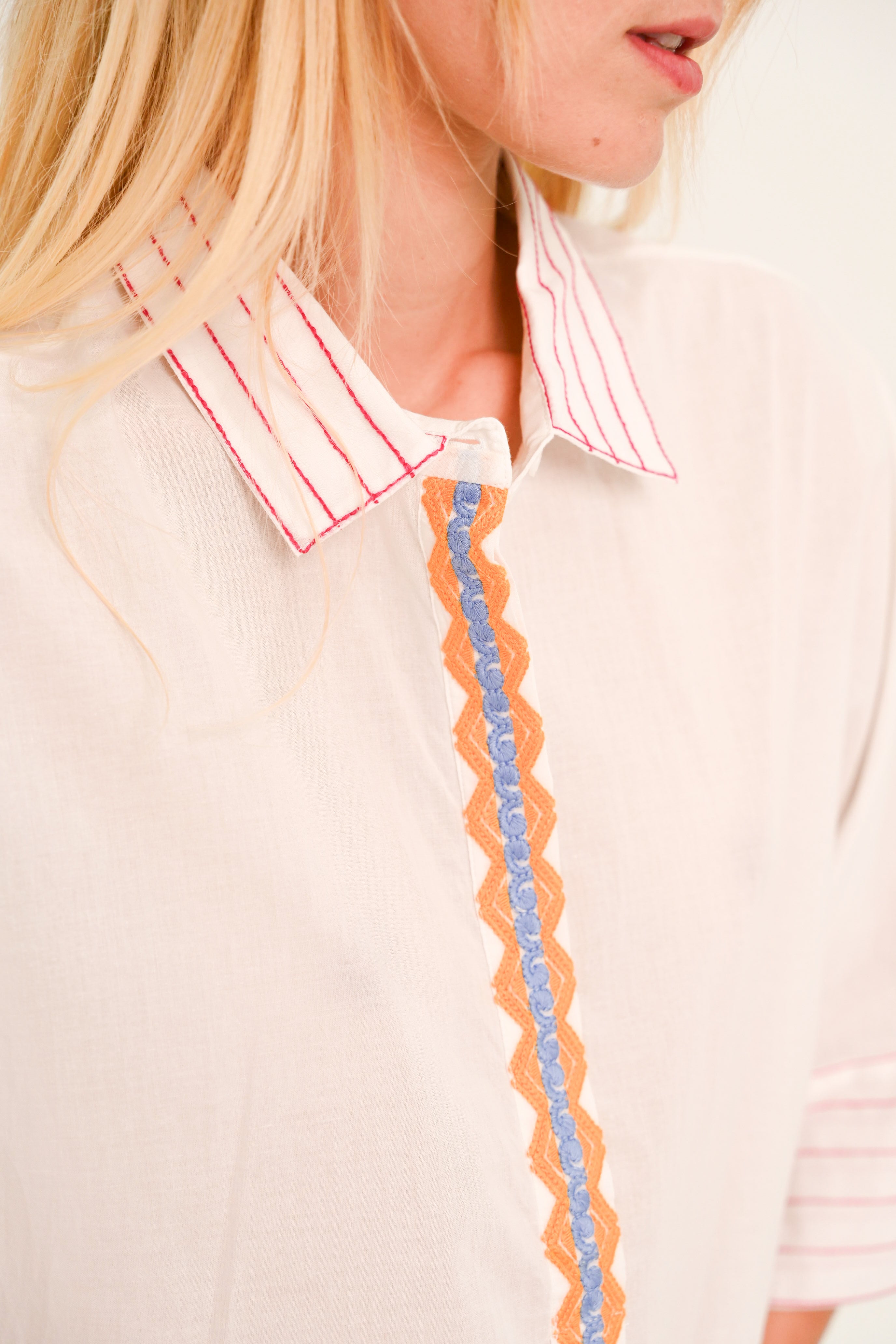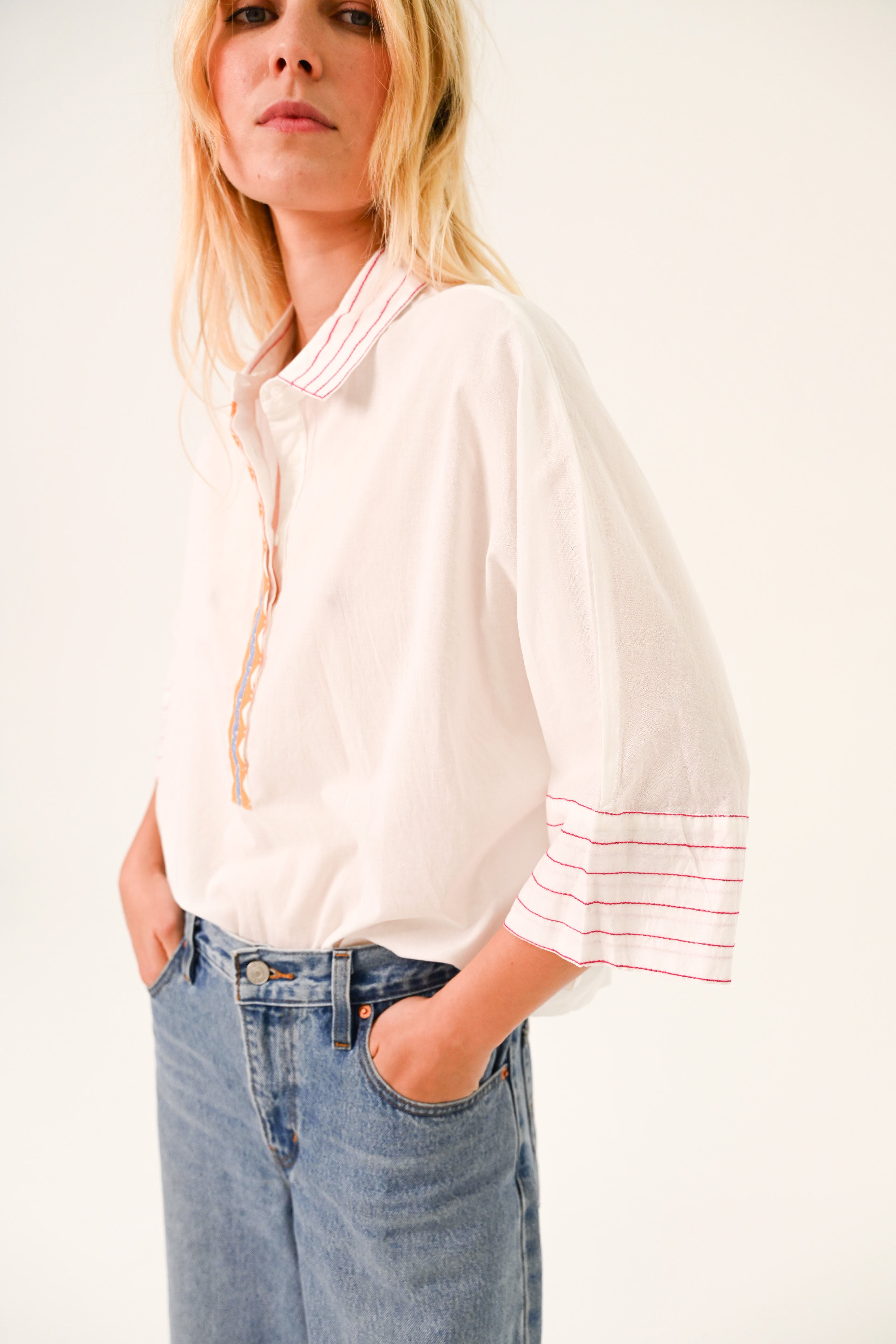 Clean cut shirt with half front button placket and classic collar. The sleeves are 3/4 length with dropped shoulders. Detailed stitching on cuff and placket stand out on the white base.