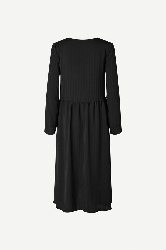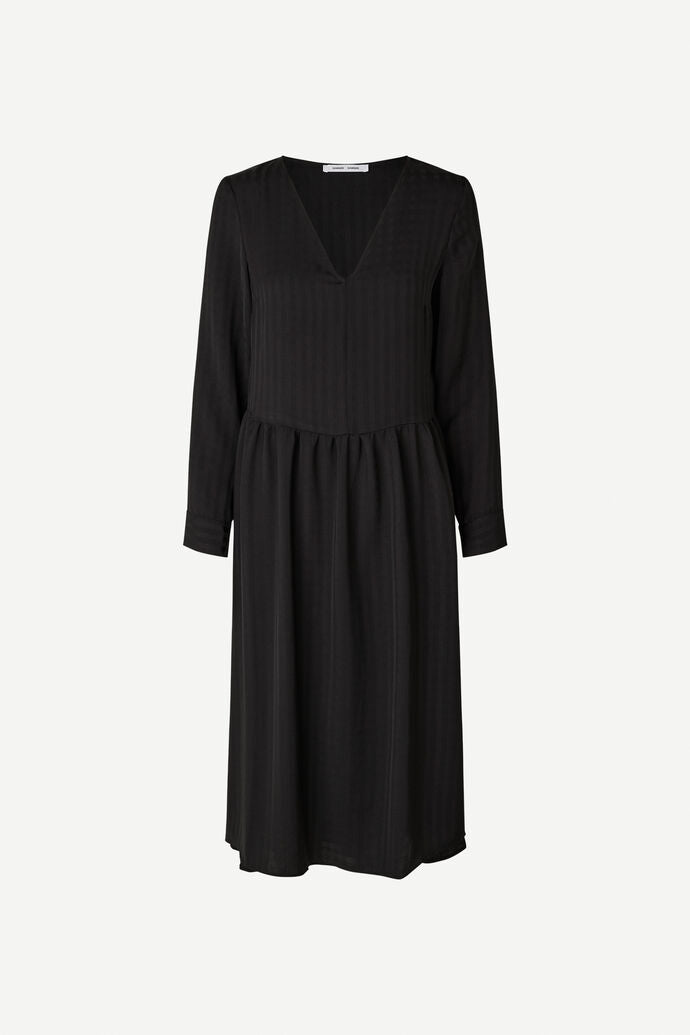 Here with the ultimate comfortable long dress; relaxed fitting with a gathered waist and full hem. Comes with a V-neckline and in the Off Black colour they call Caviar. Recycled polyester blend fabric with a tonal woven stripe.