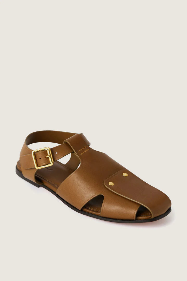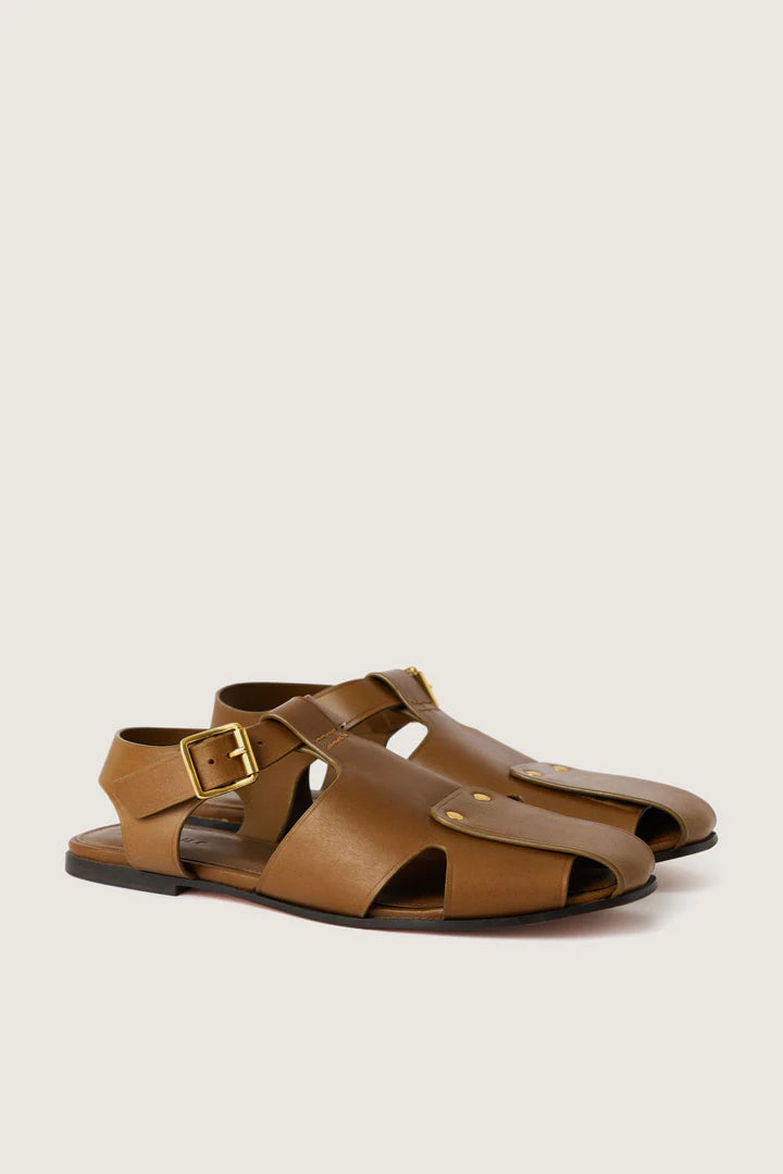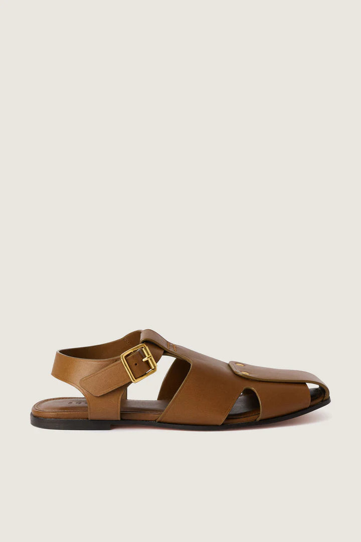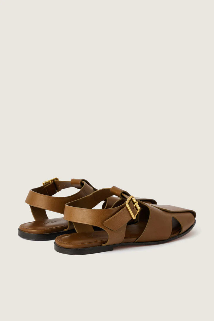Flat leather sandals in bronze brown. This gladiator style pair works very well with trousers and dresses alike.