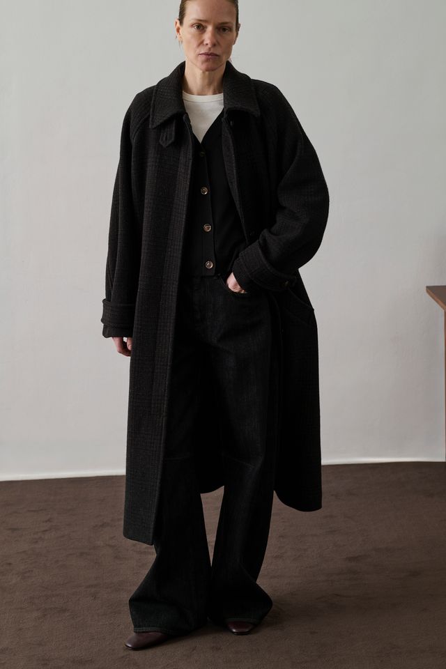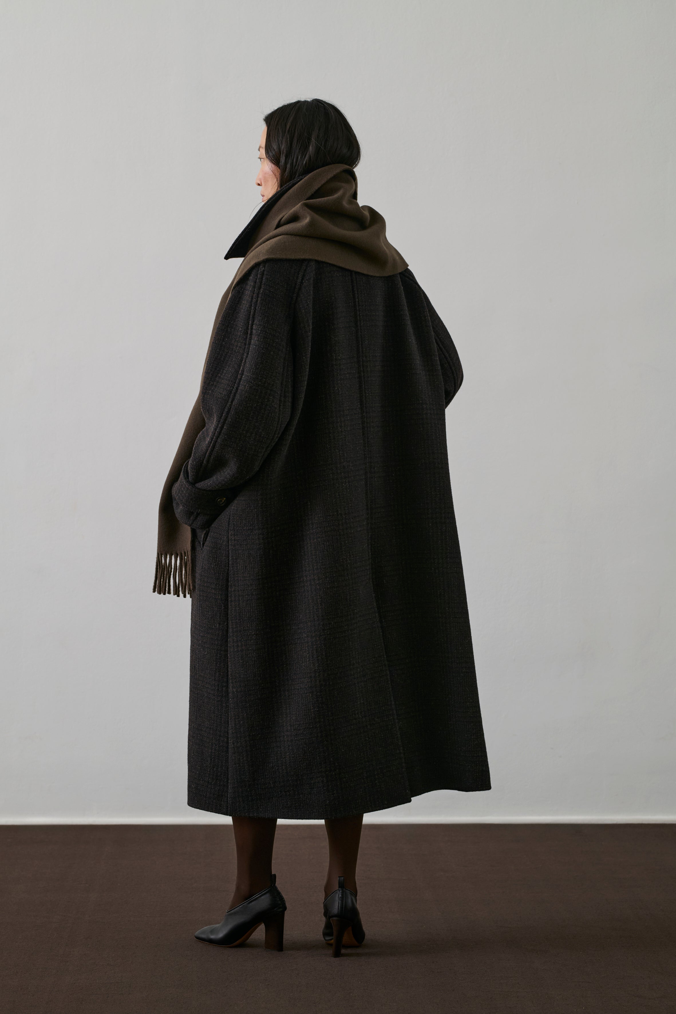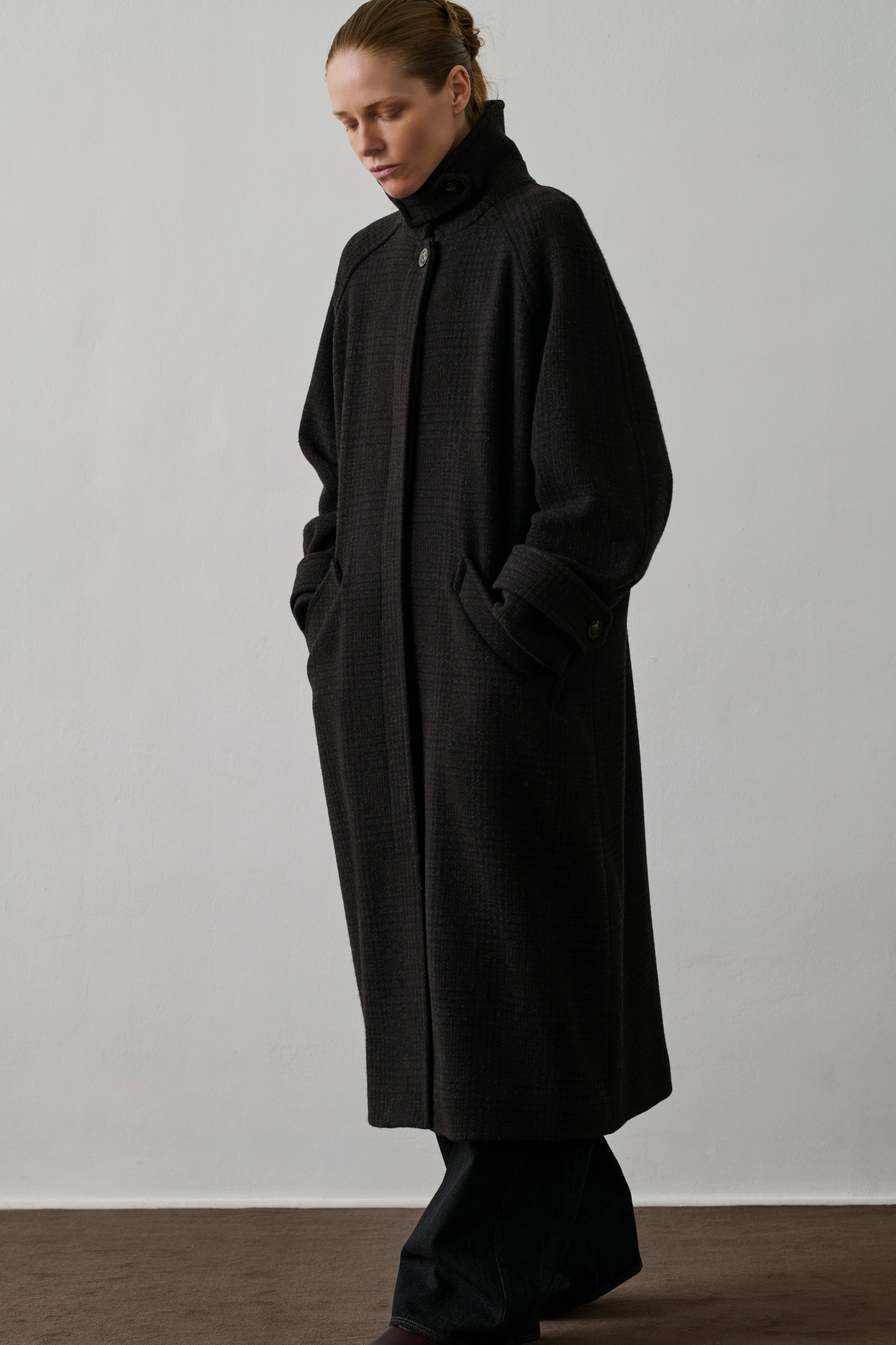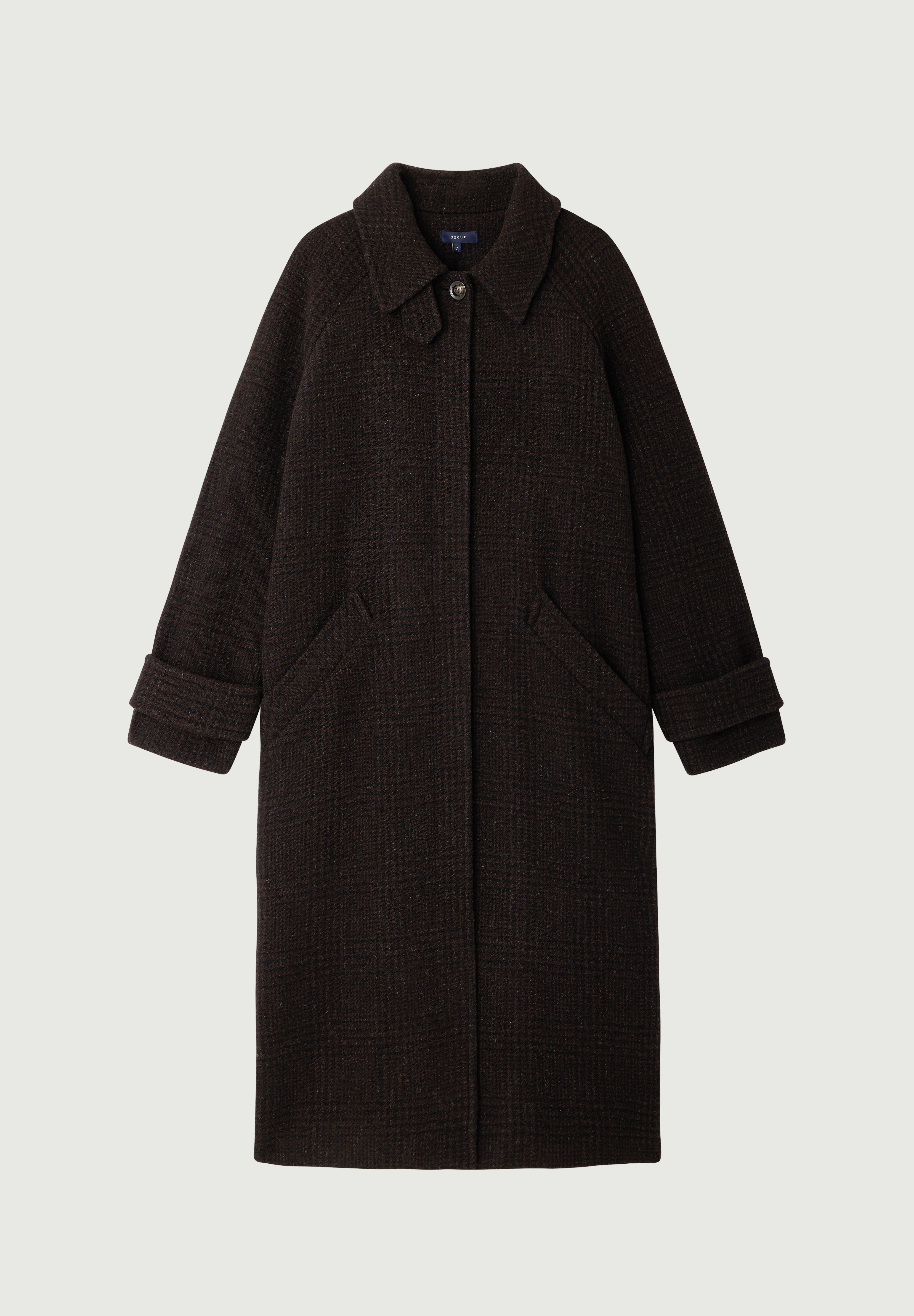 Checked, long coat in 100% wool. Small collar and full button closure. Designed for a relaxed fit.
