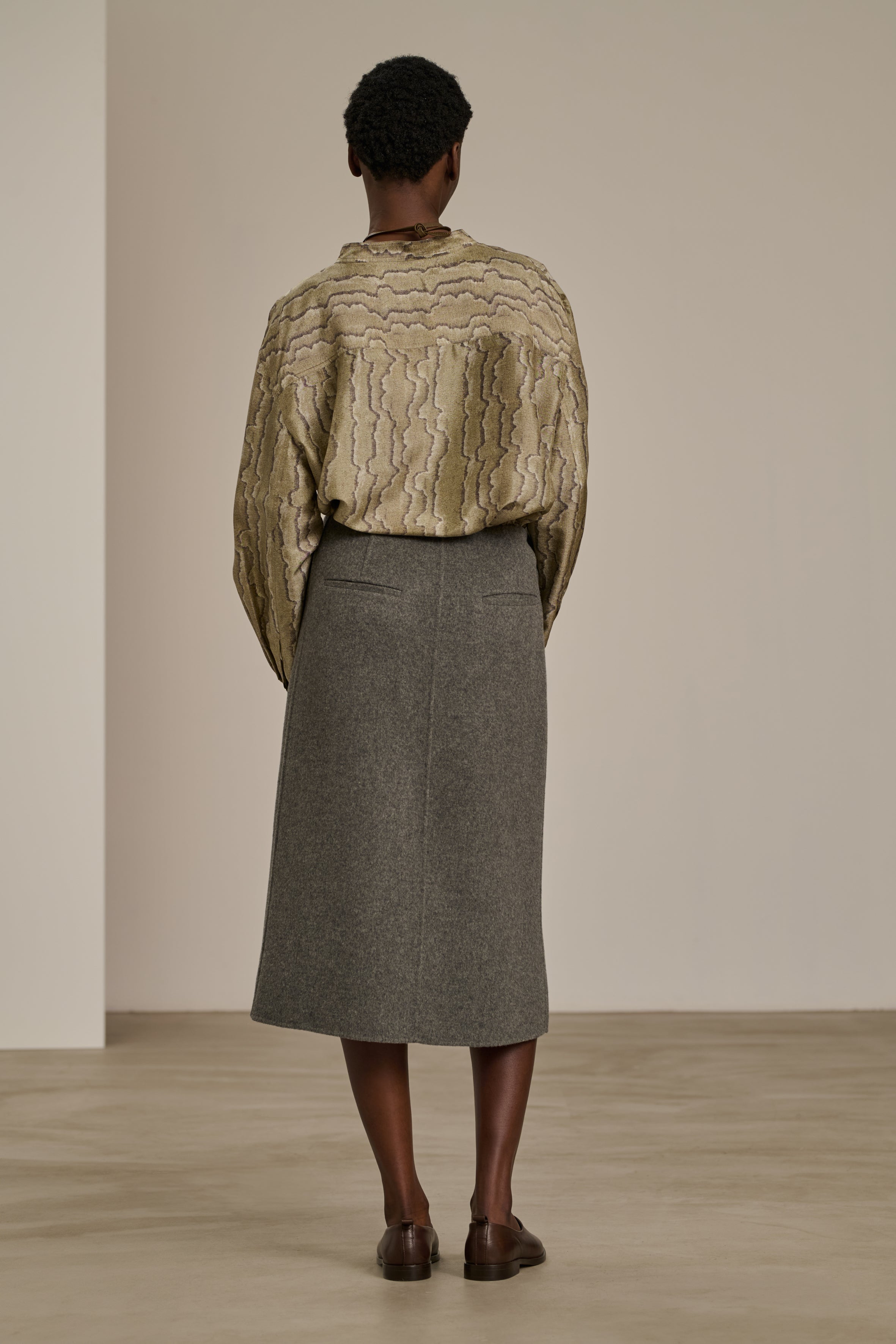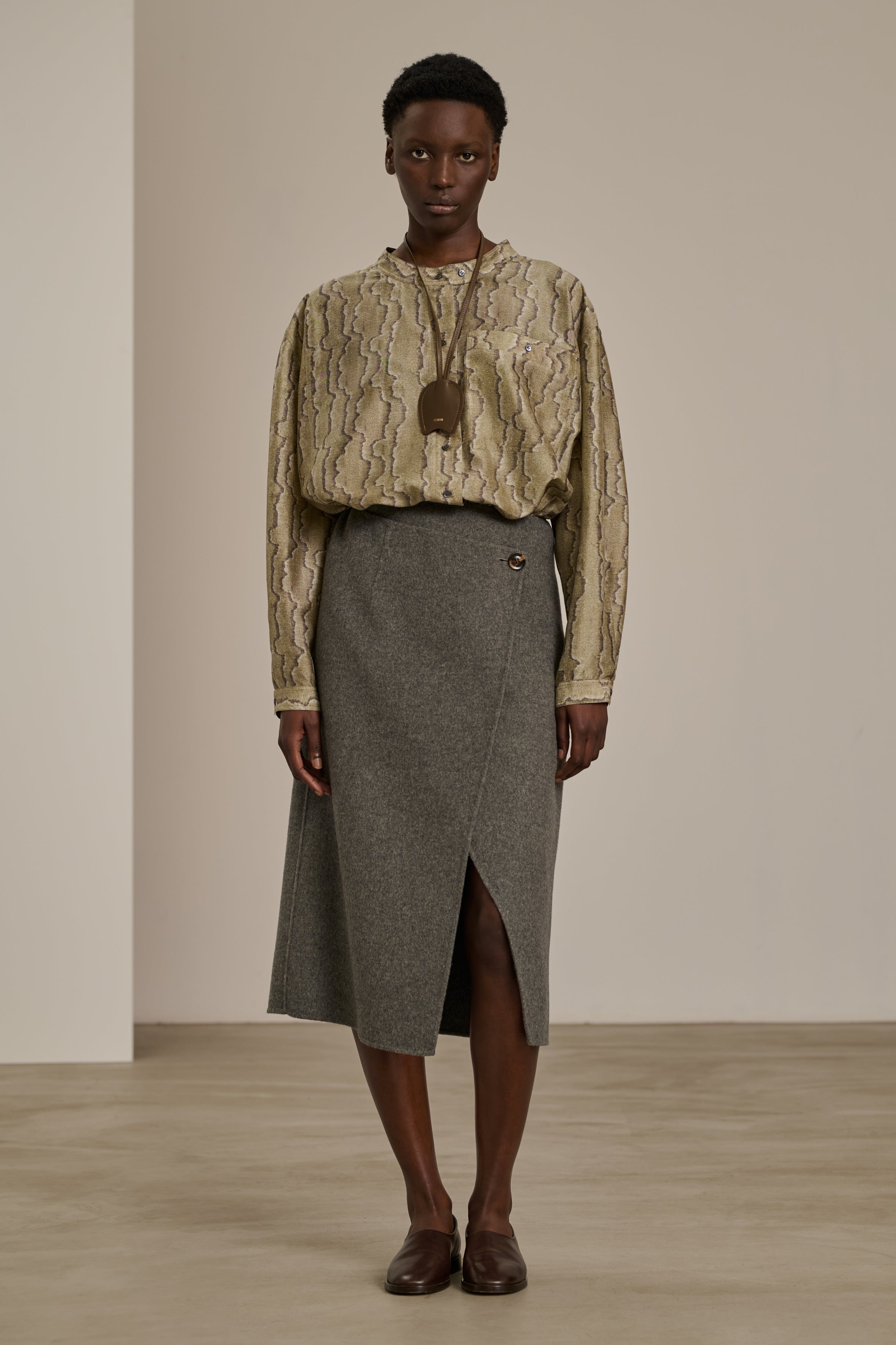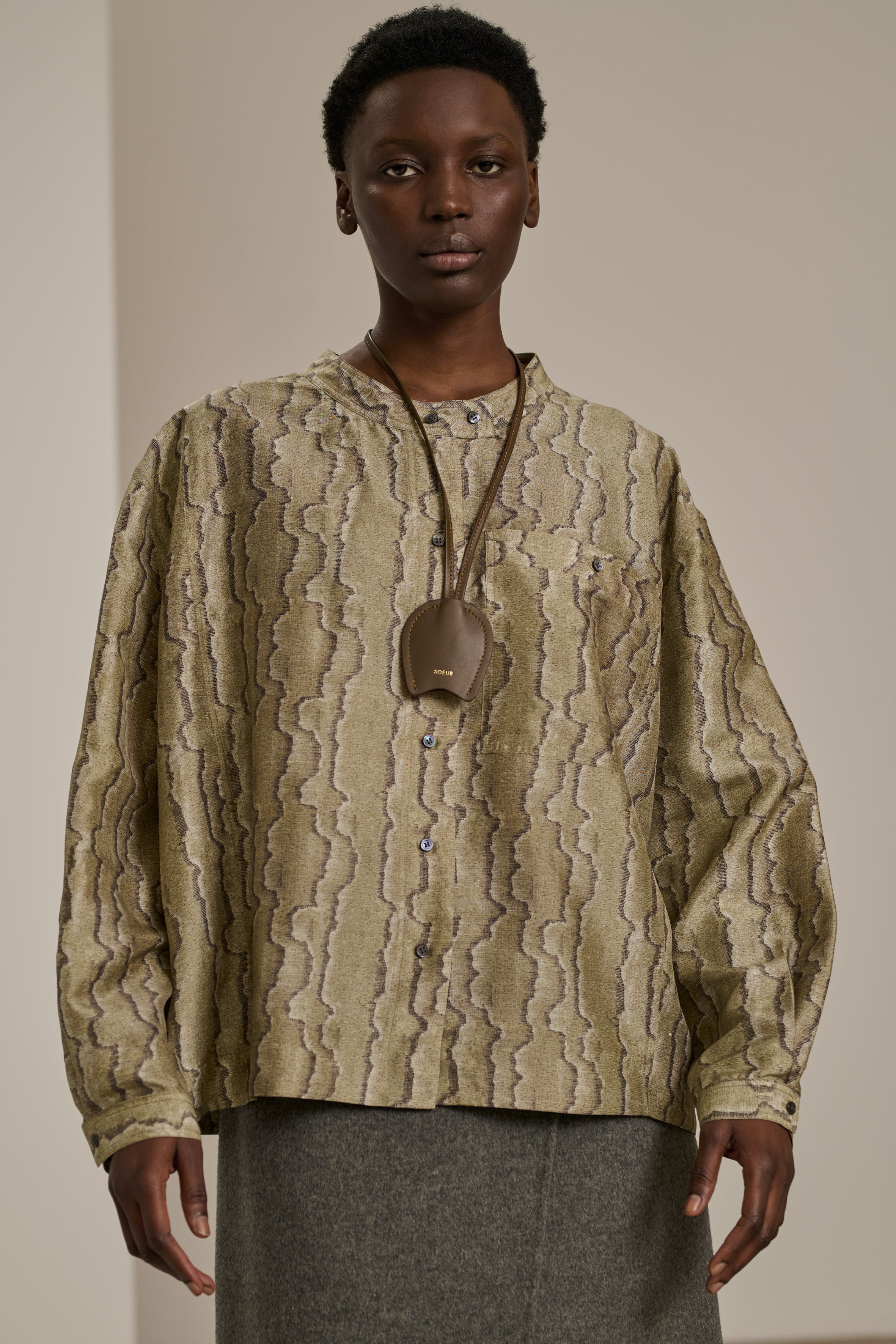 Boxy cut silk blouse from Soeur in grey and green snake inspired pattern. It is oversized and collarless with long loose sleeves with buttoned cuff. Featuring a classic button closure with a buttoned chest pocket.