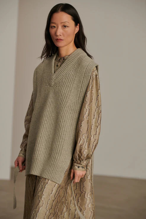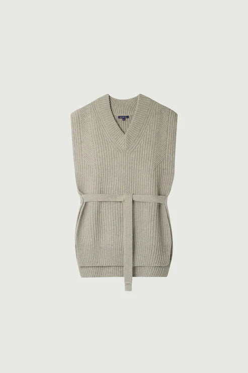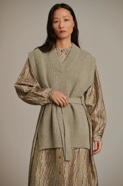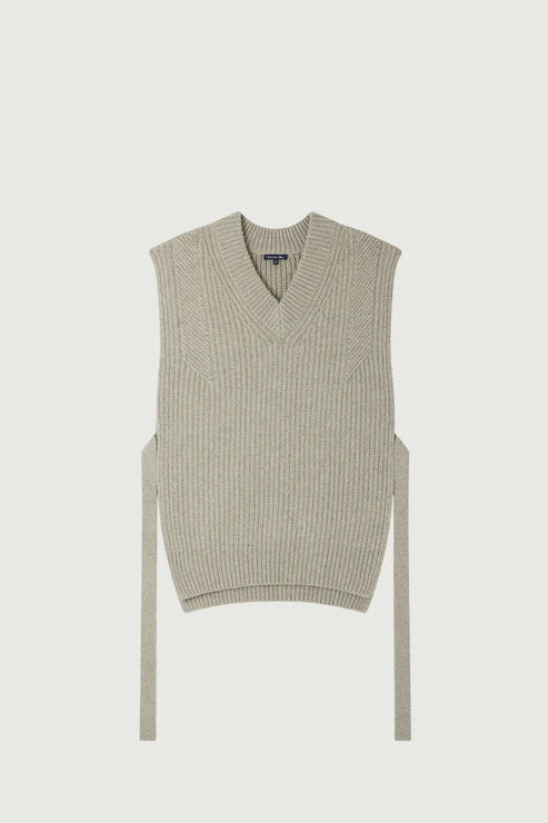 Knitted vest with open sides and ties to wrap around or leave on the sides for different looks. This 100% wool piece is sure to keep you warm this winter.