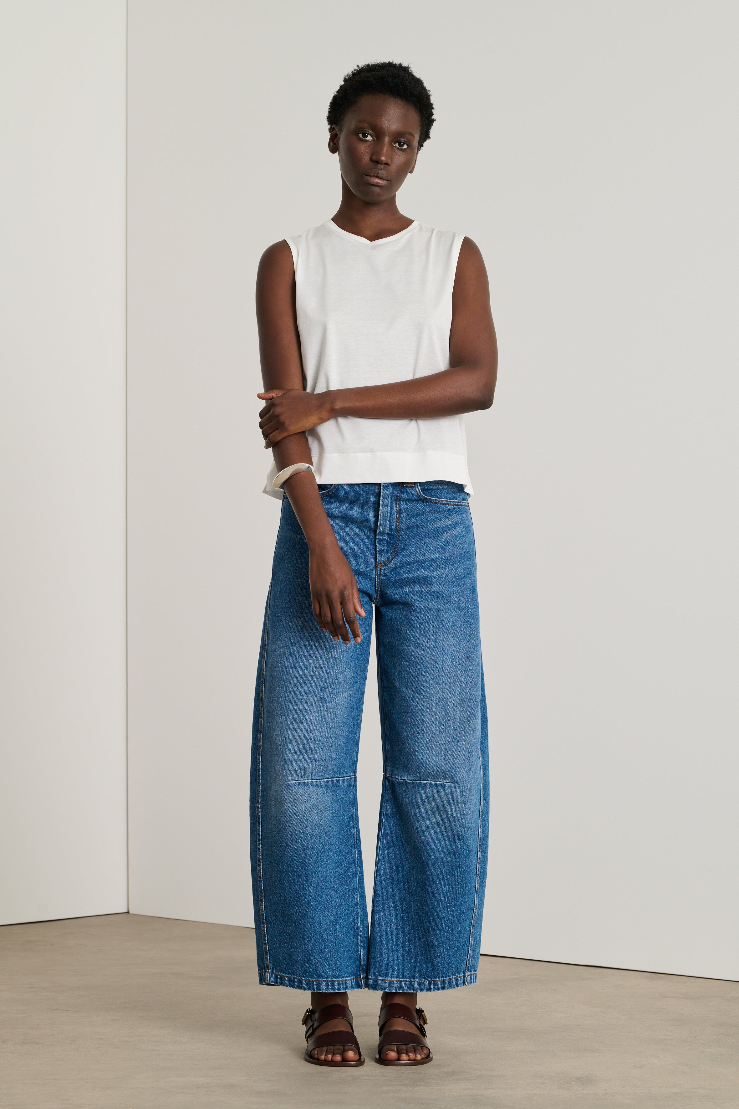 Curved jeans with loose fit in the perfect mid blue wash. They come with a zip and button closure and front and back pockets.