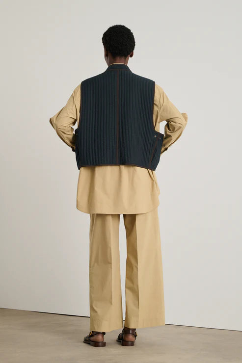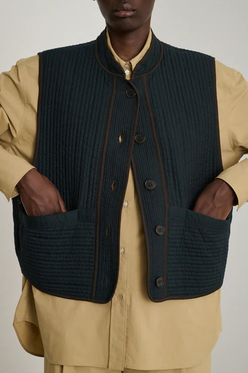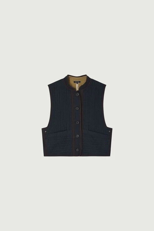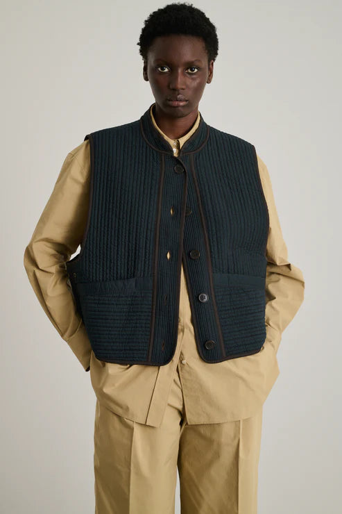 Short gilet with a generous and rounded cut. This one comes quilted to add that extra warmth and to keep the boxy shape.
