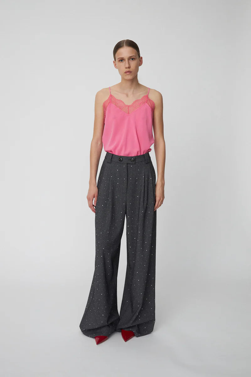 Wide legged suit trousers with relaxed fit made special with all-over rhinestones. They sparkle against the dark grey base making them a perfect pair for dressy evenings. They come high waisted with zip and double-button closure, belt loops, front pleats and side pockets.