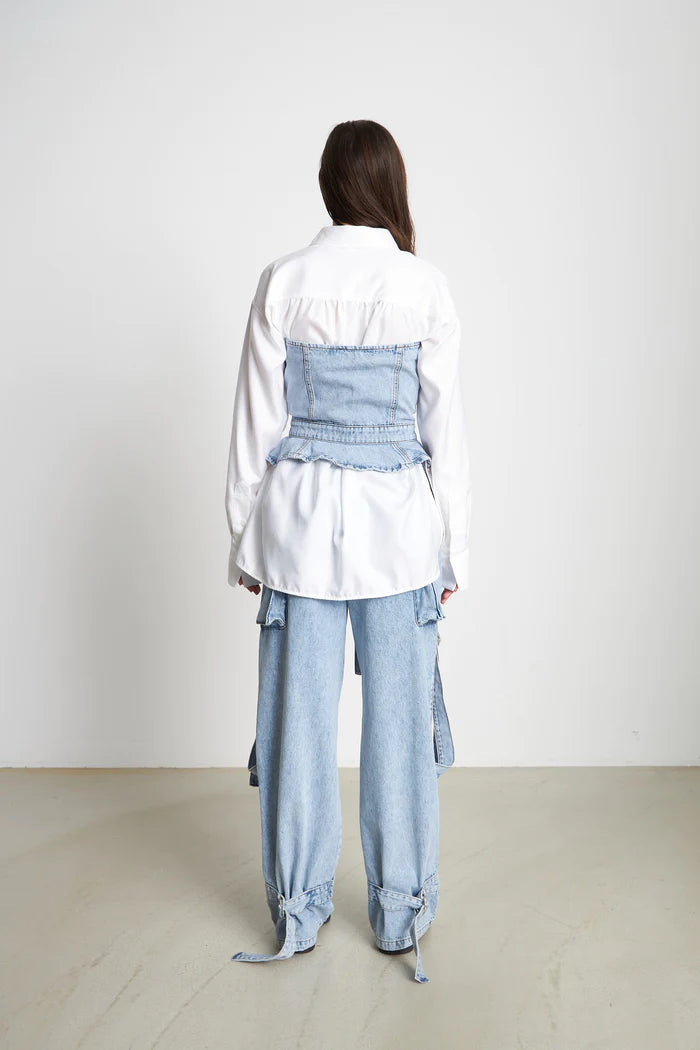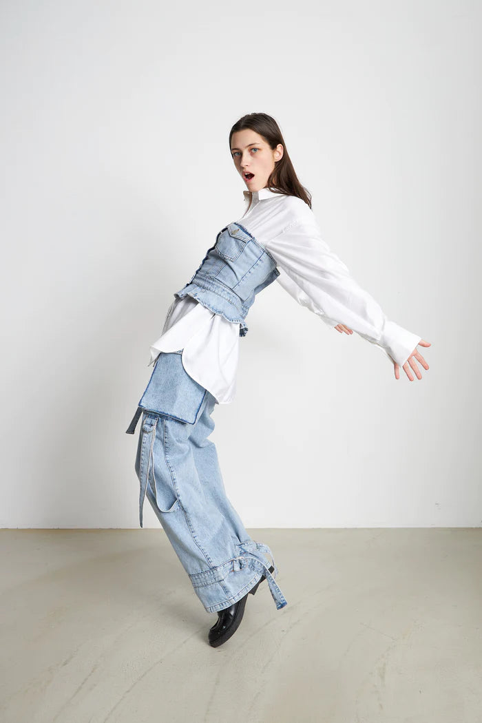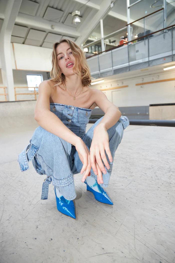 Strapless denim top with buttons and chest pockets. Small peplum effect from the waist down.