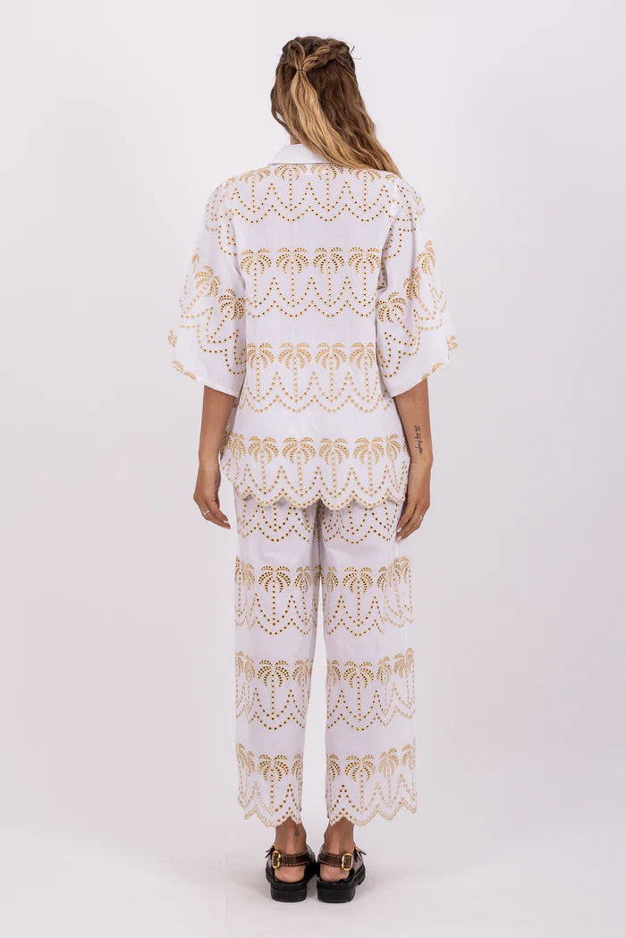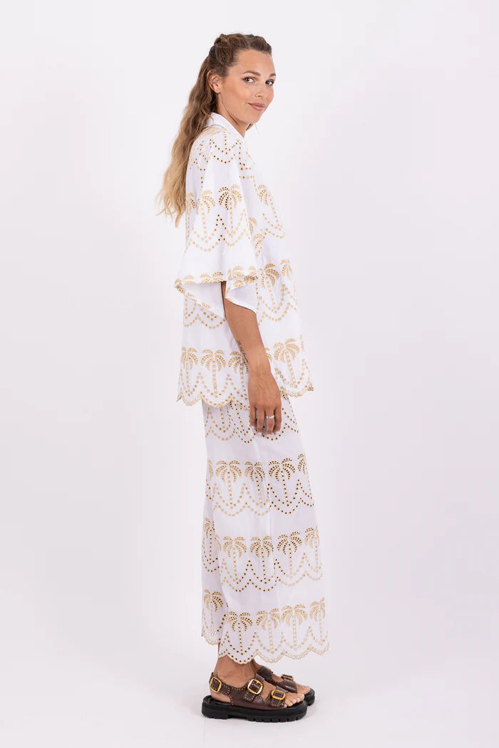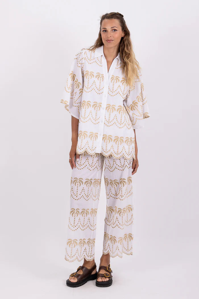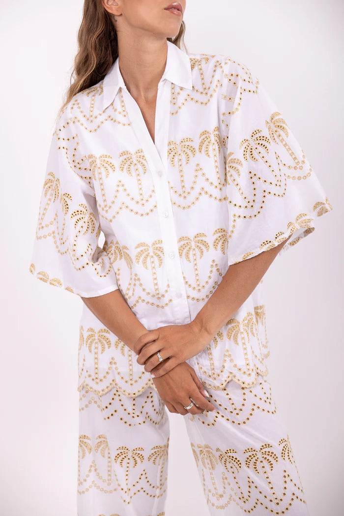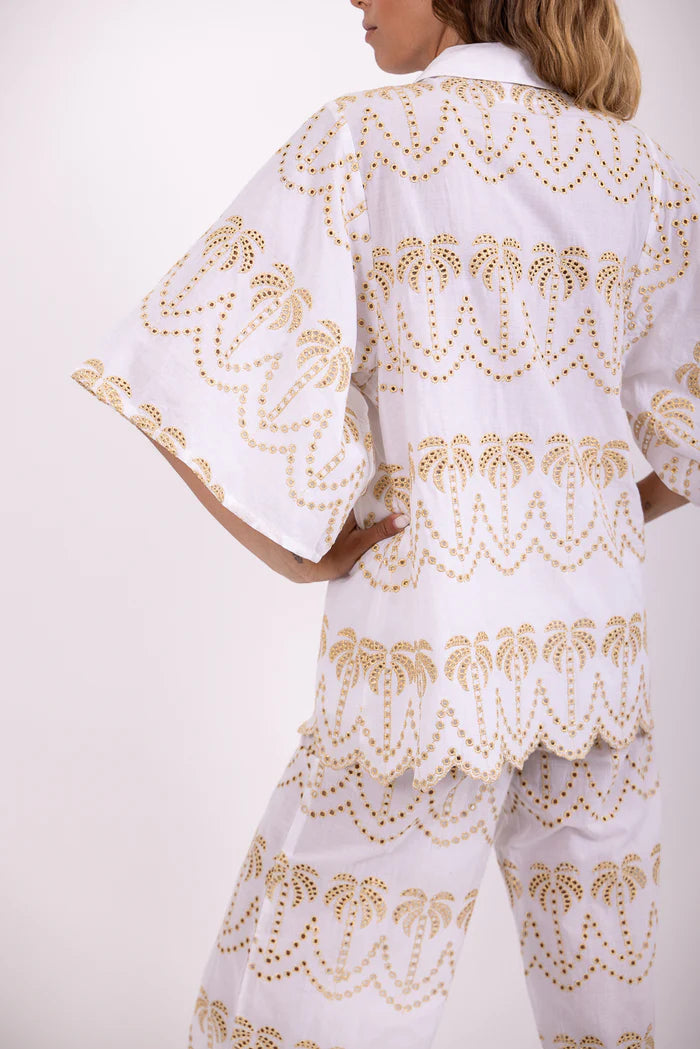 Made in eyelet palm trees sublime by a golden topstitching. The Lupy shirt has flared midi sleeves, collared V-neck with button closure.