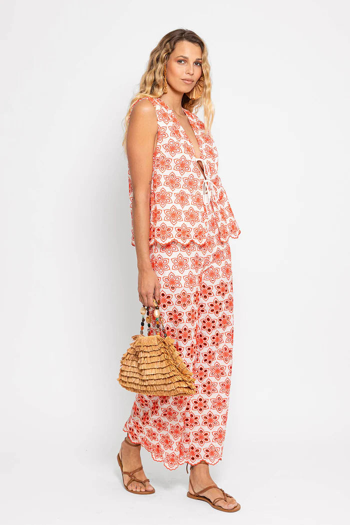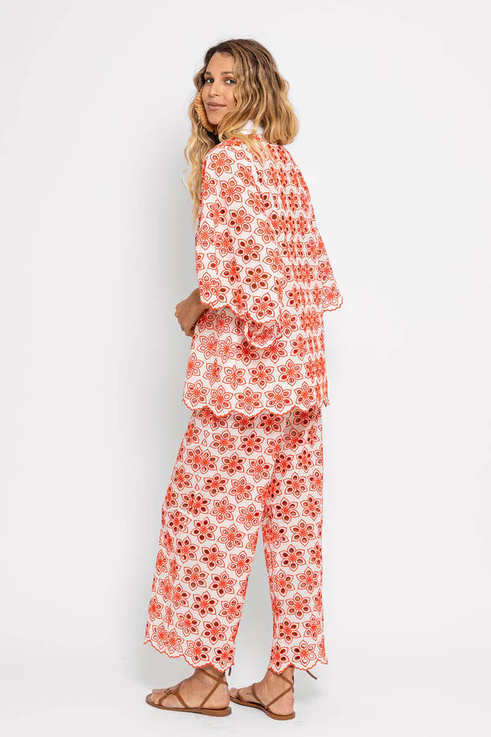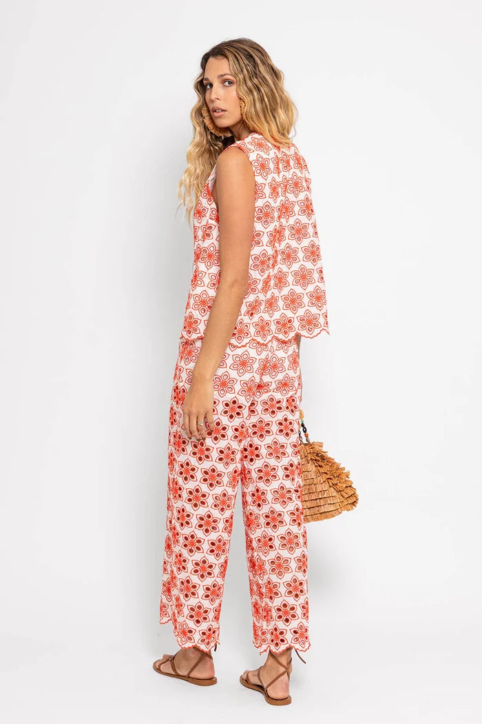 Made in eyelet with contrasting red topstitching. The Lupy trousers have a flared leg with a shift cut and an invisible zip at the side.