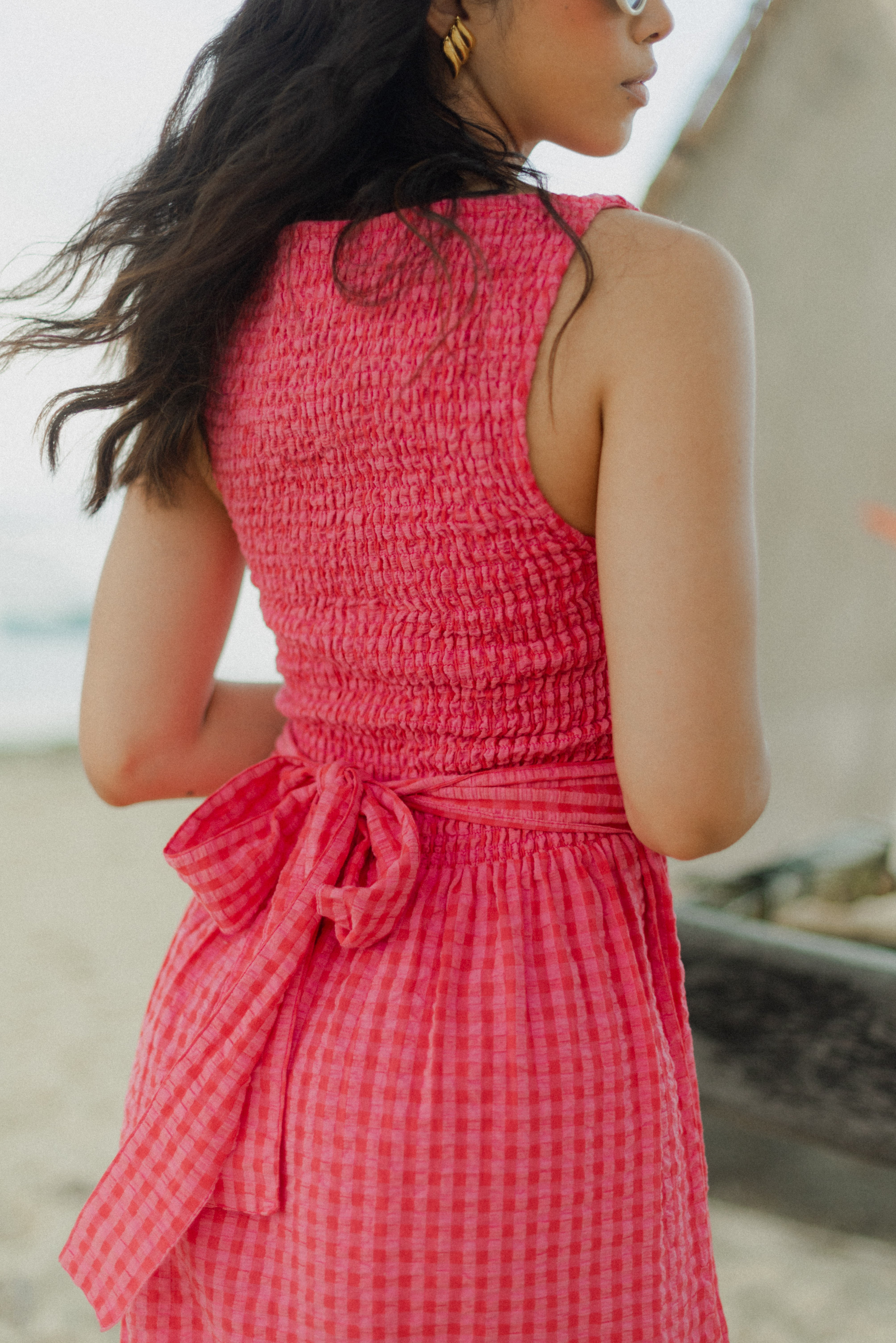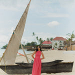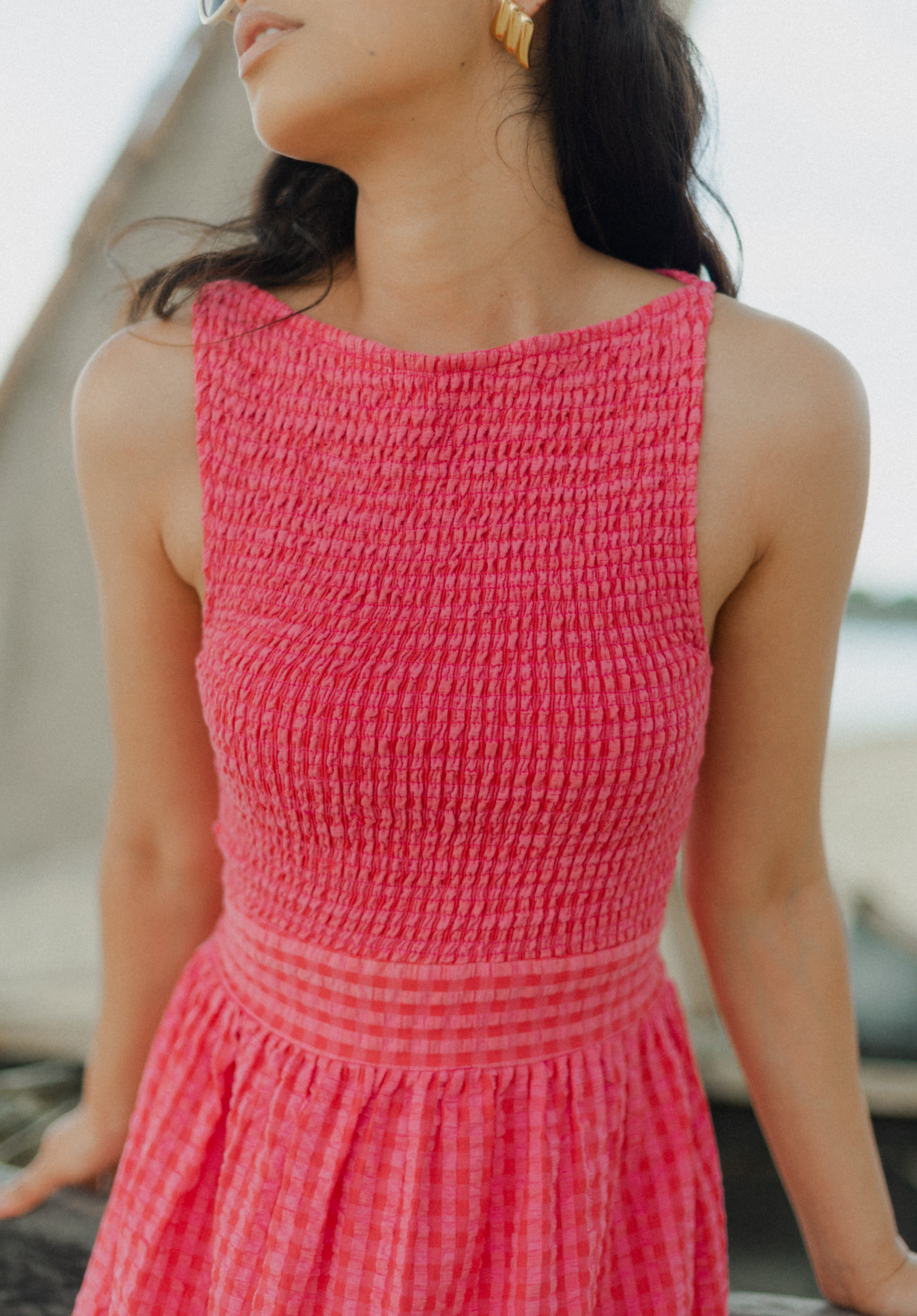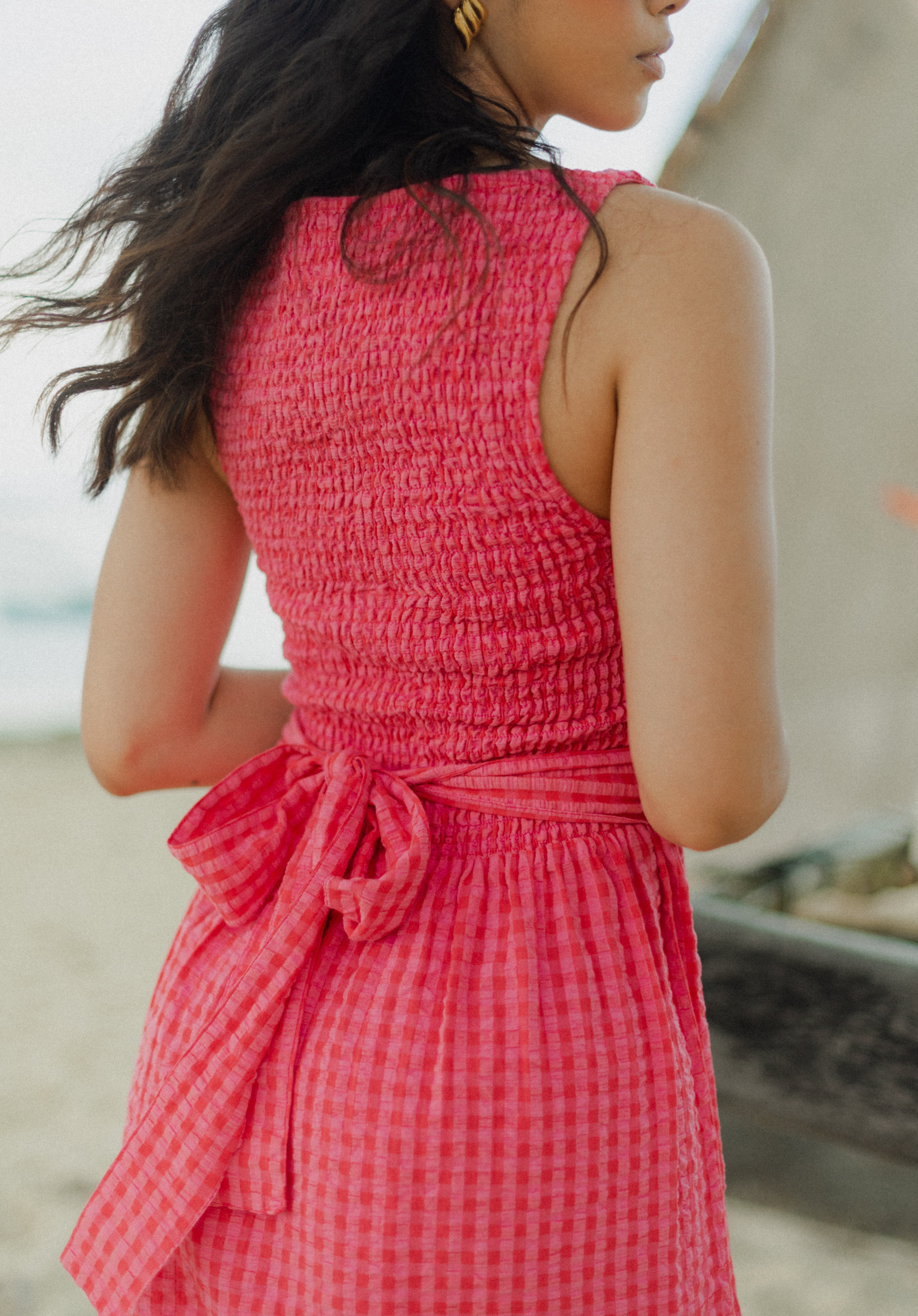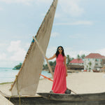 The Marguerite Dress is a sleeveless maxi dress with shirred bodice and loose, straight cut skirt. It is made in an exclusive Sundress print: pink and red mini gingham and comes with a wide waistband to tie in the back, or front.