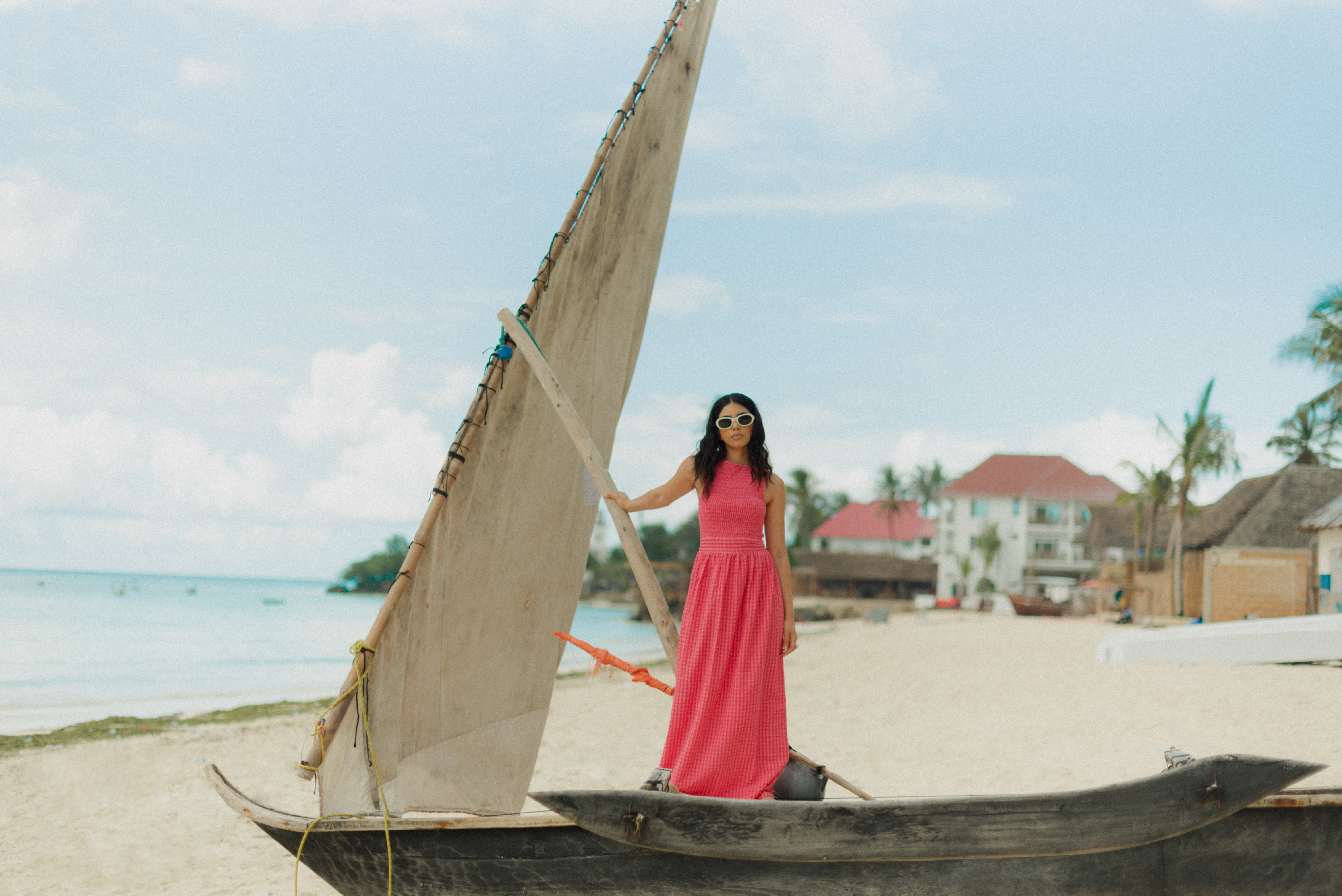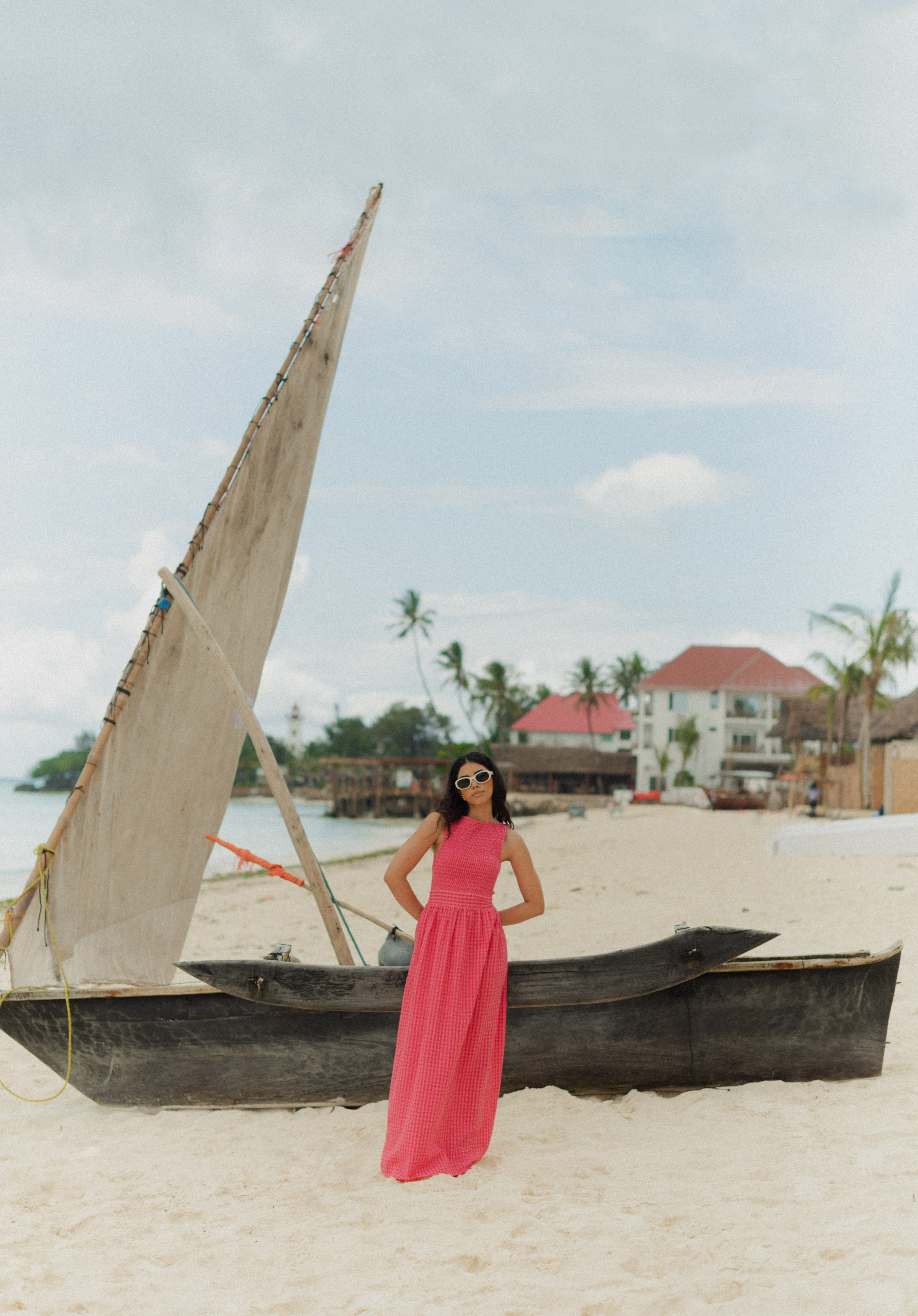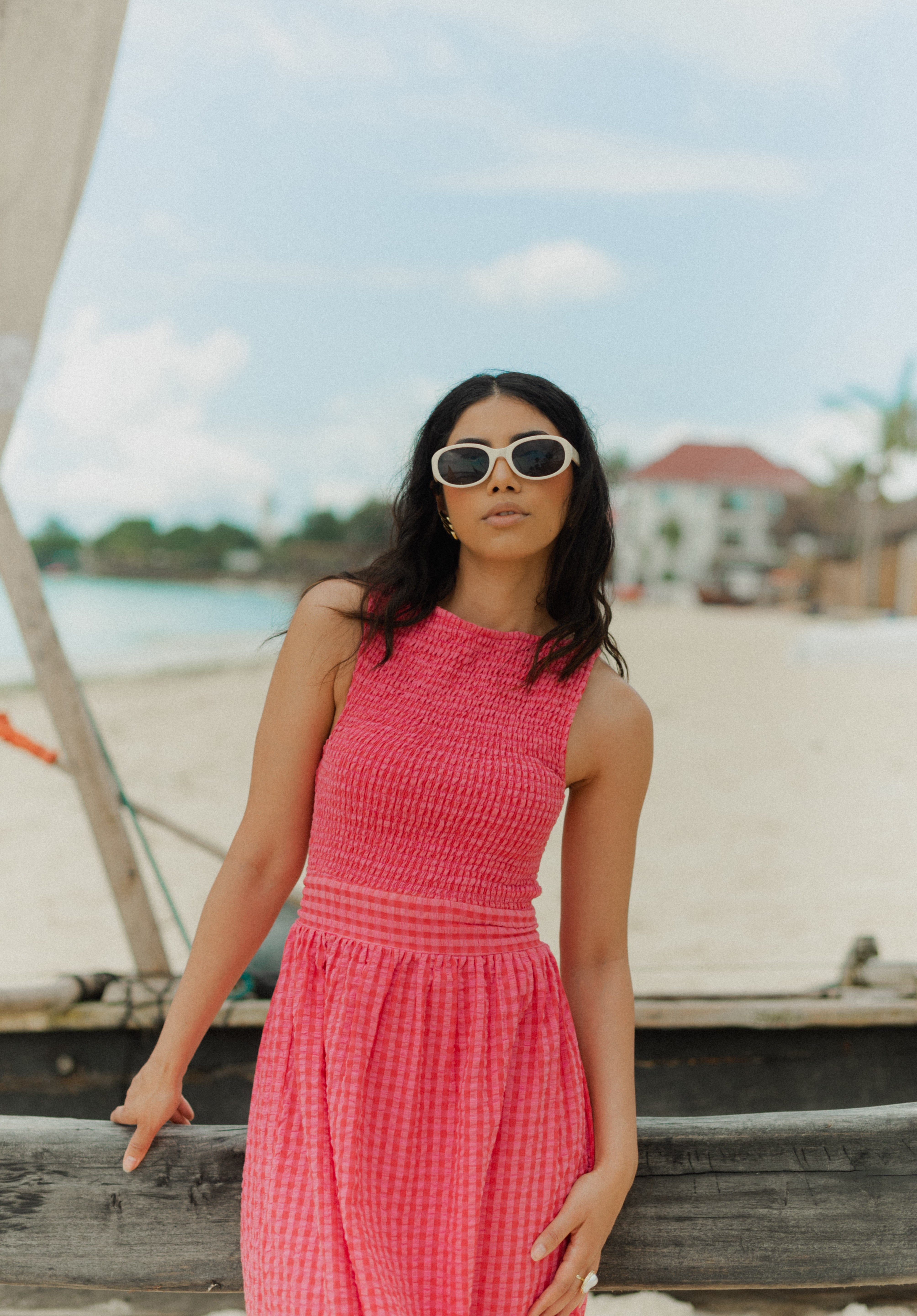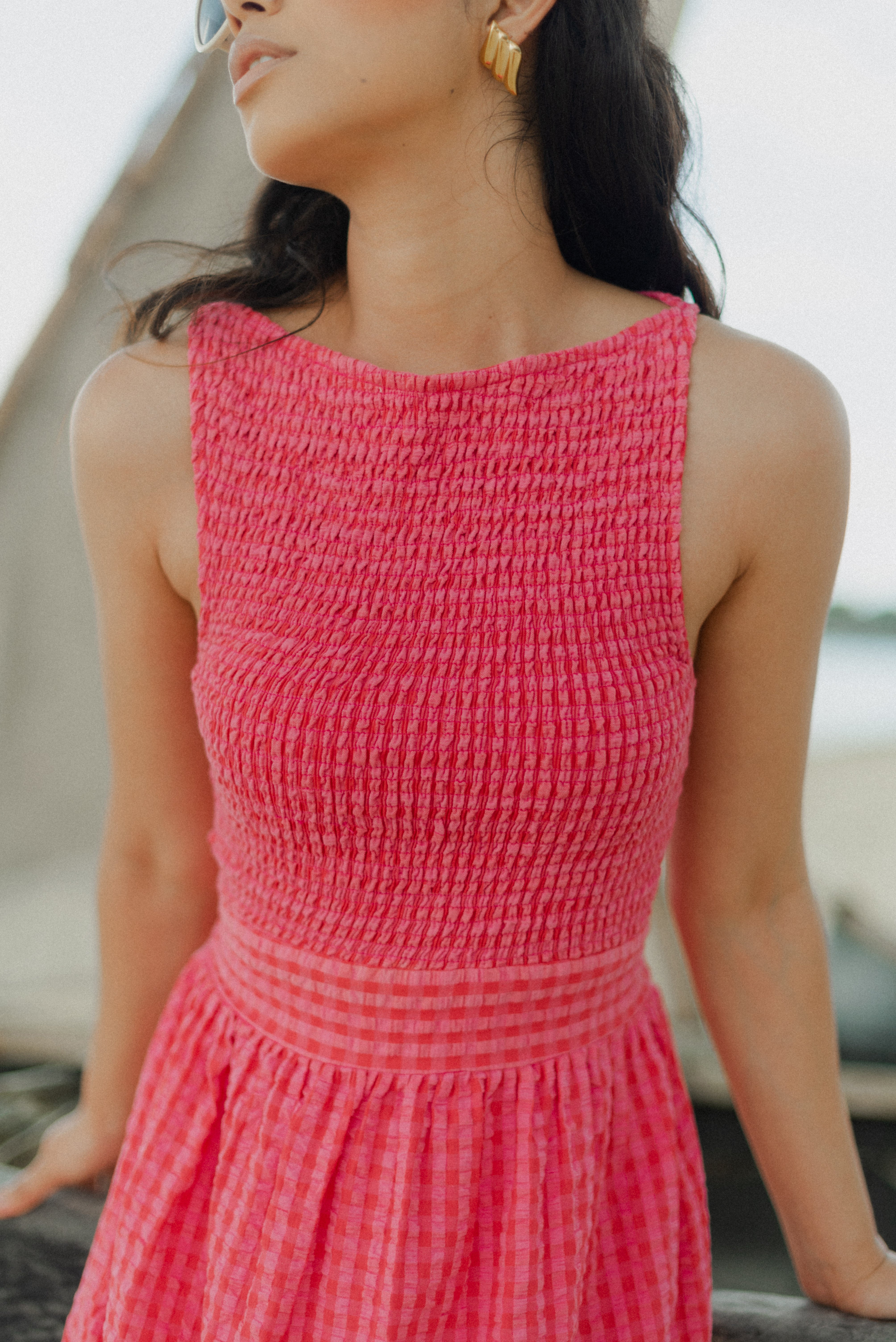The Marguerite Dress is a sleeveless maxi dress with shirred bodice and loose, straight cut skirt. It is made in an exclusive Sundress print: pink and red mini gingham and comes with a wide waistband to tie in the back, or front.