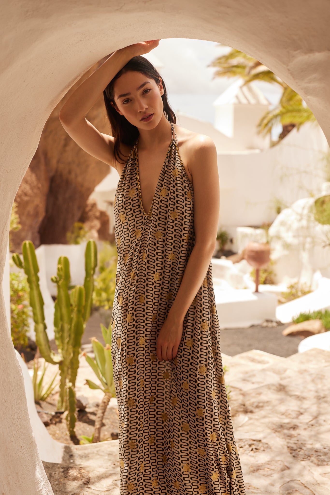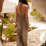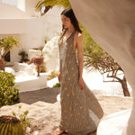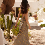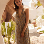 Long and loose, the Natasha Dress is made in an exclusive Sundress print: black and white mini waves adorned with glittery golden suns. It has a plunging V-neckline with long tie strings to fasten however you like. Opt for the classic halter neck style or maybe get adventurous and cross over the back and wrap around the waist.