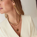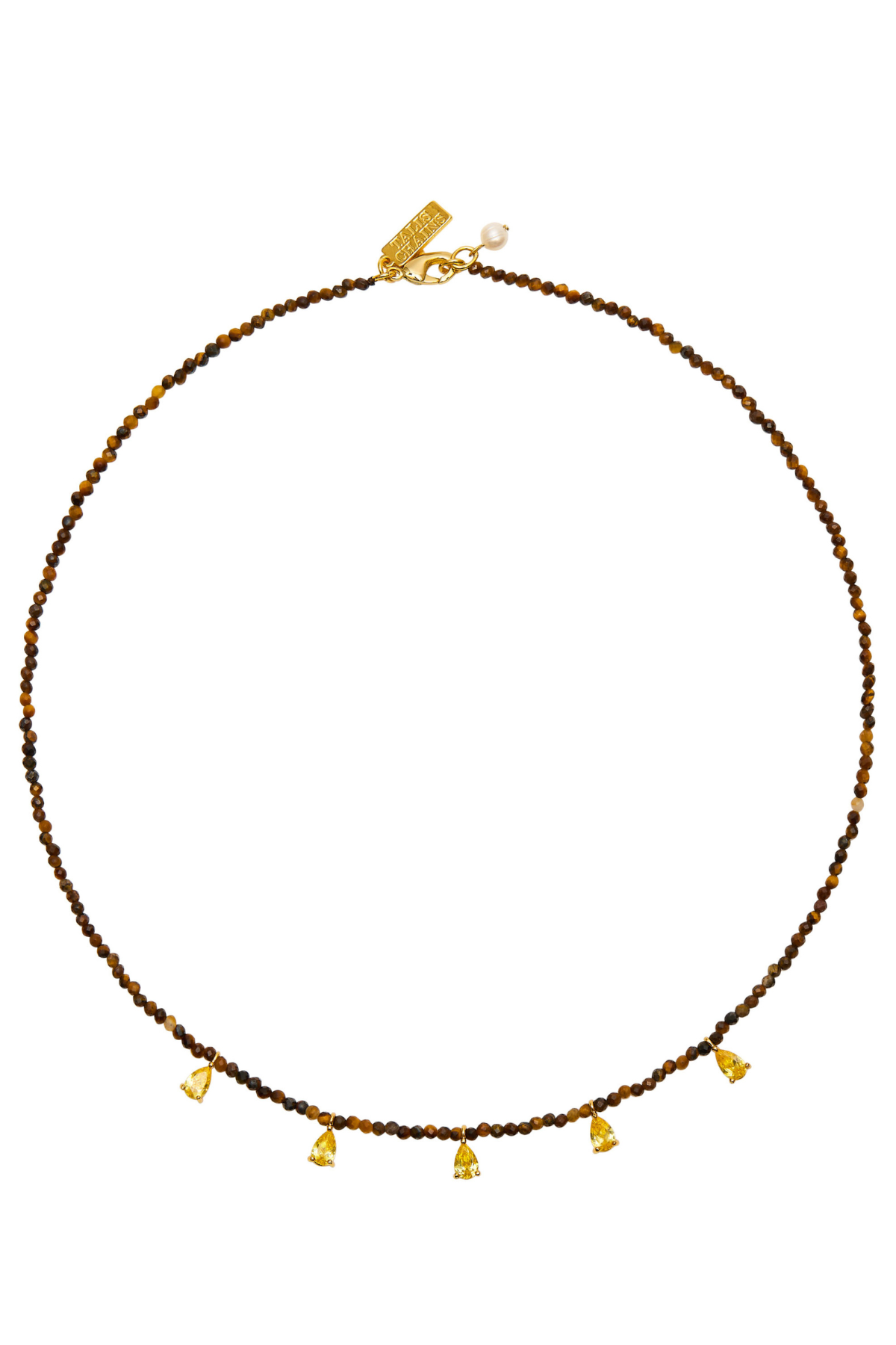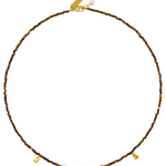 Delicately beaded necklace in tiger's eye beads with golden cubic zirconia drops.