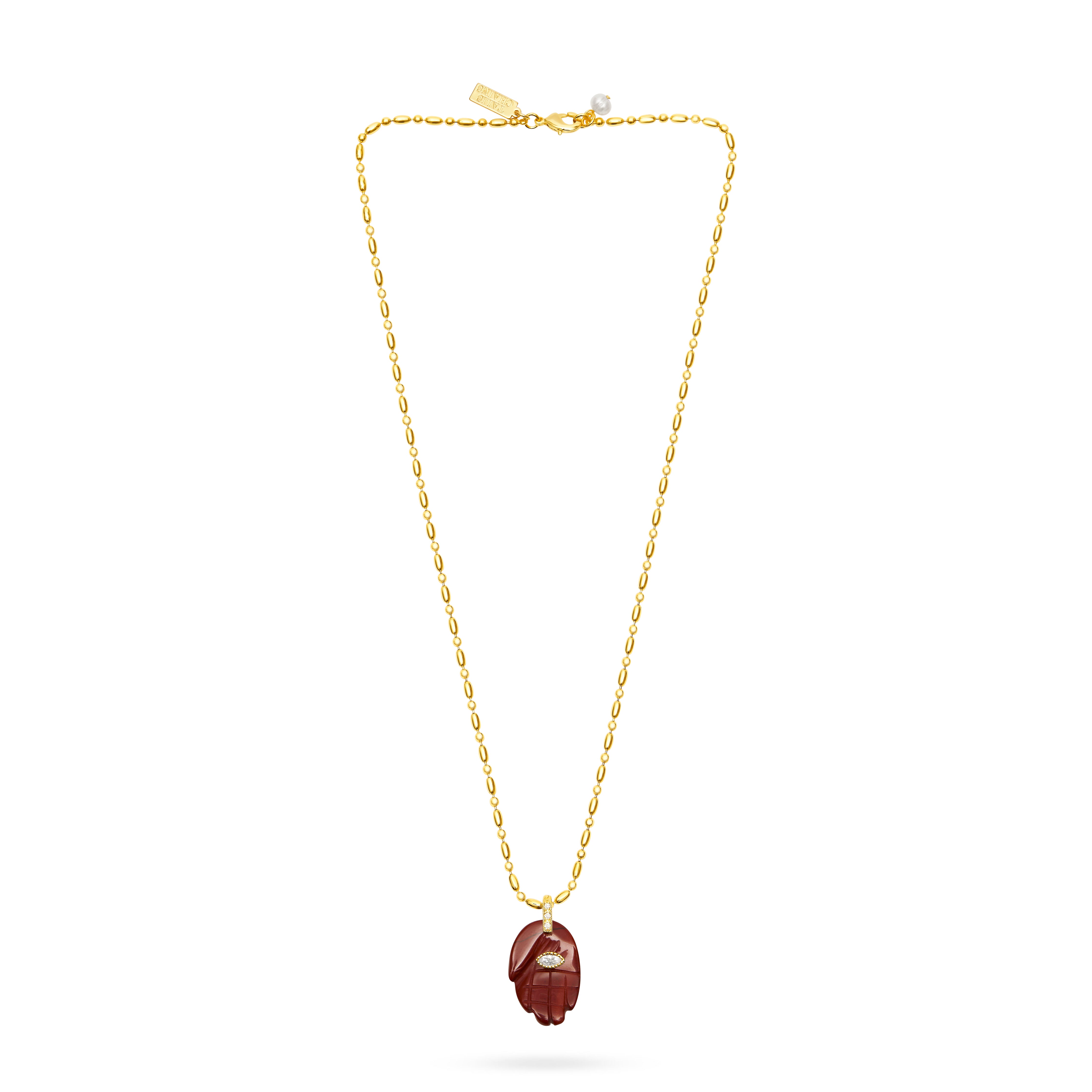 Light necklace chain with a Cornelia stone Hamsa Hand pendant.