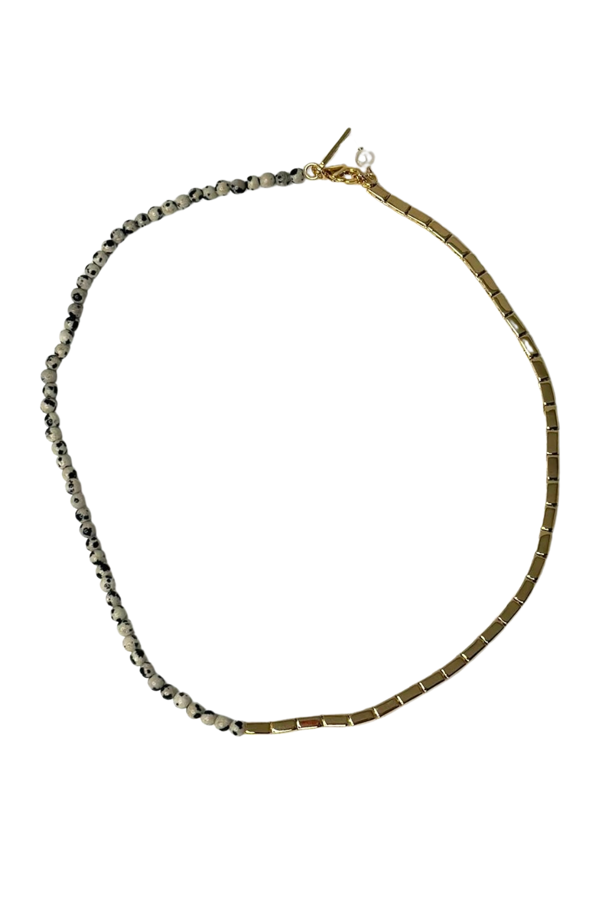 Golden choker necklace, half of it adorned with Dalmatian Jasper stones.