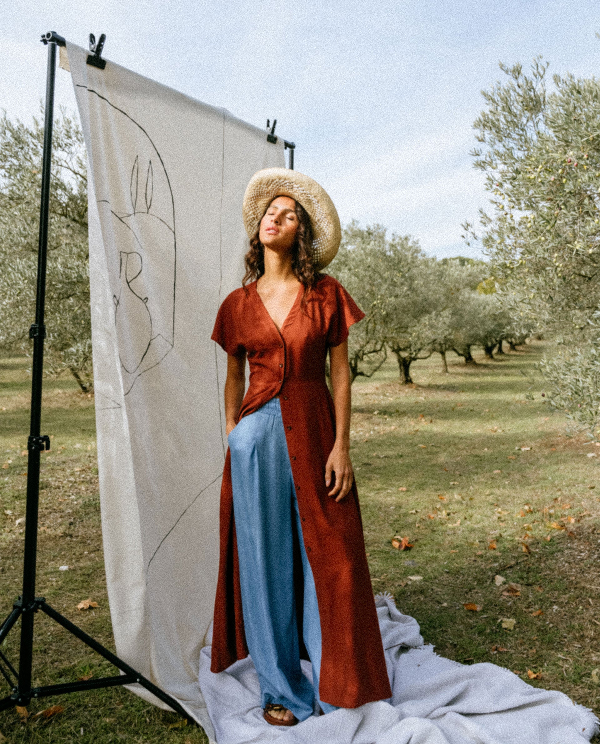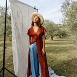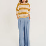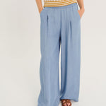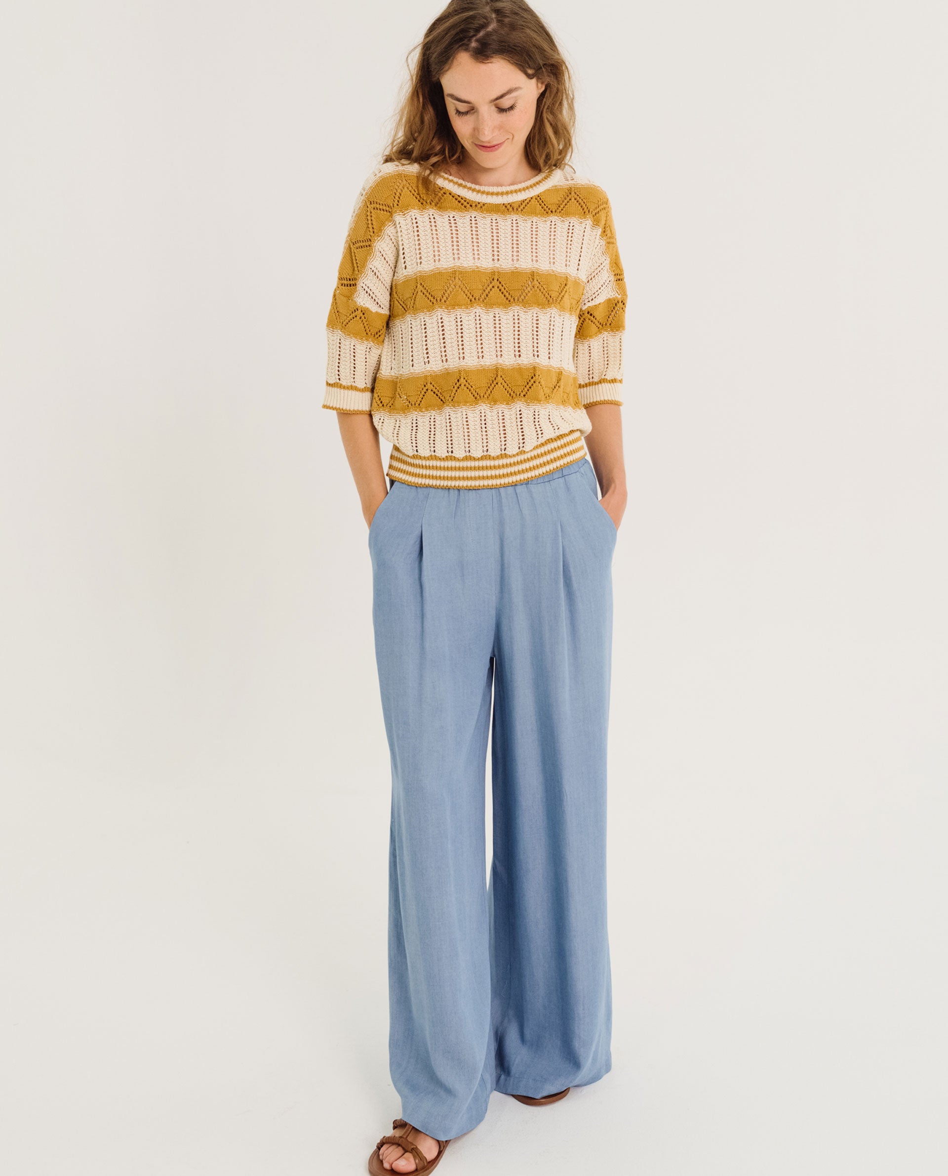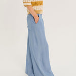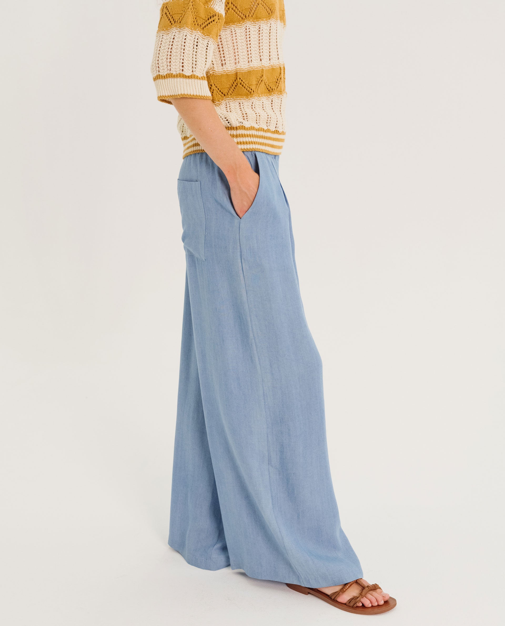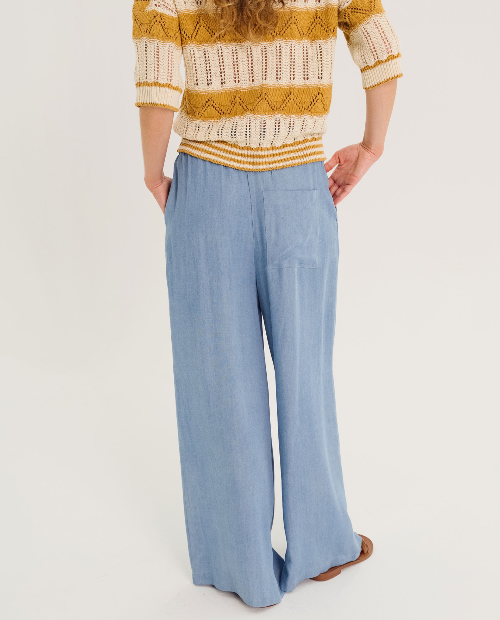 Devrig is a pair of trousers with an elasticated waist, wide front pleats and a wide straight leg. Italian pockets on the front, a patch pocket on the back. These trousers are cut in a 100% Lyocell denim fabric, fluid and feminine.