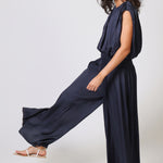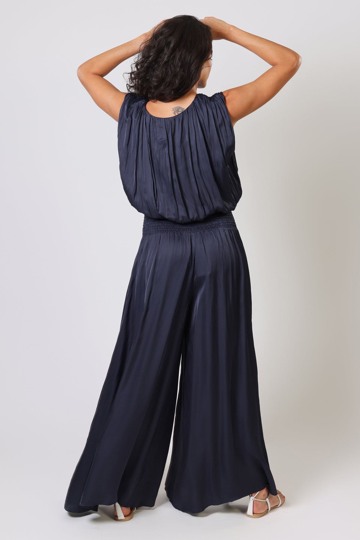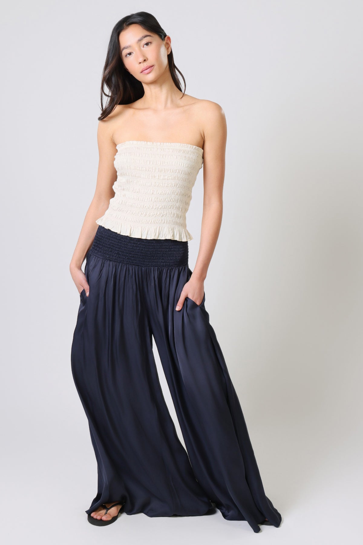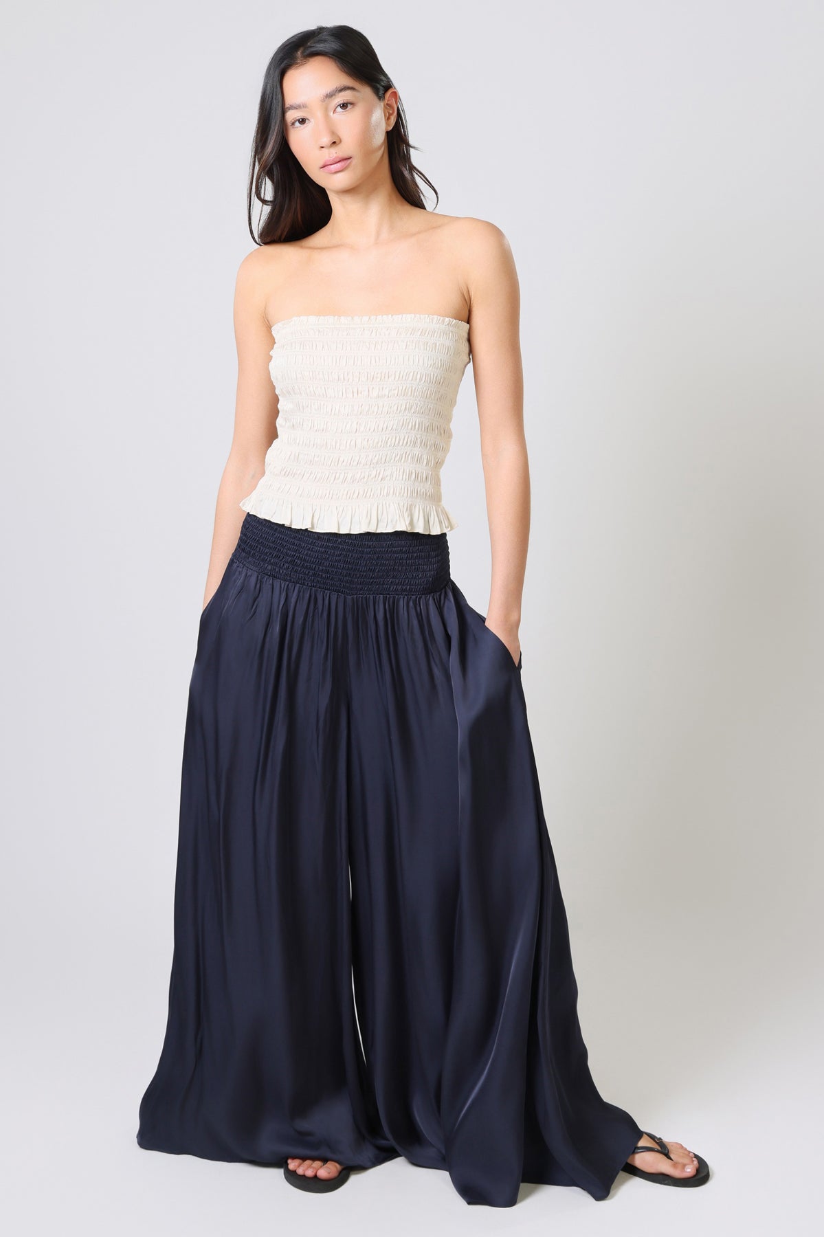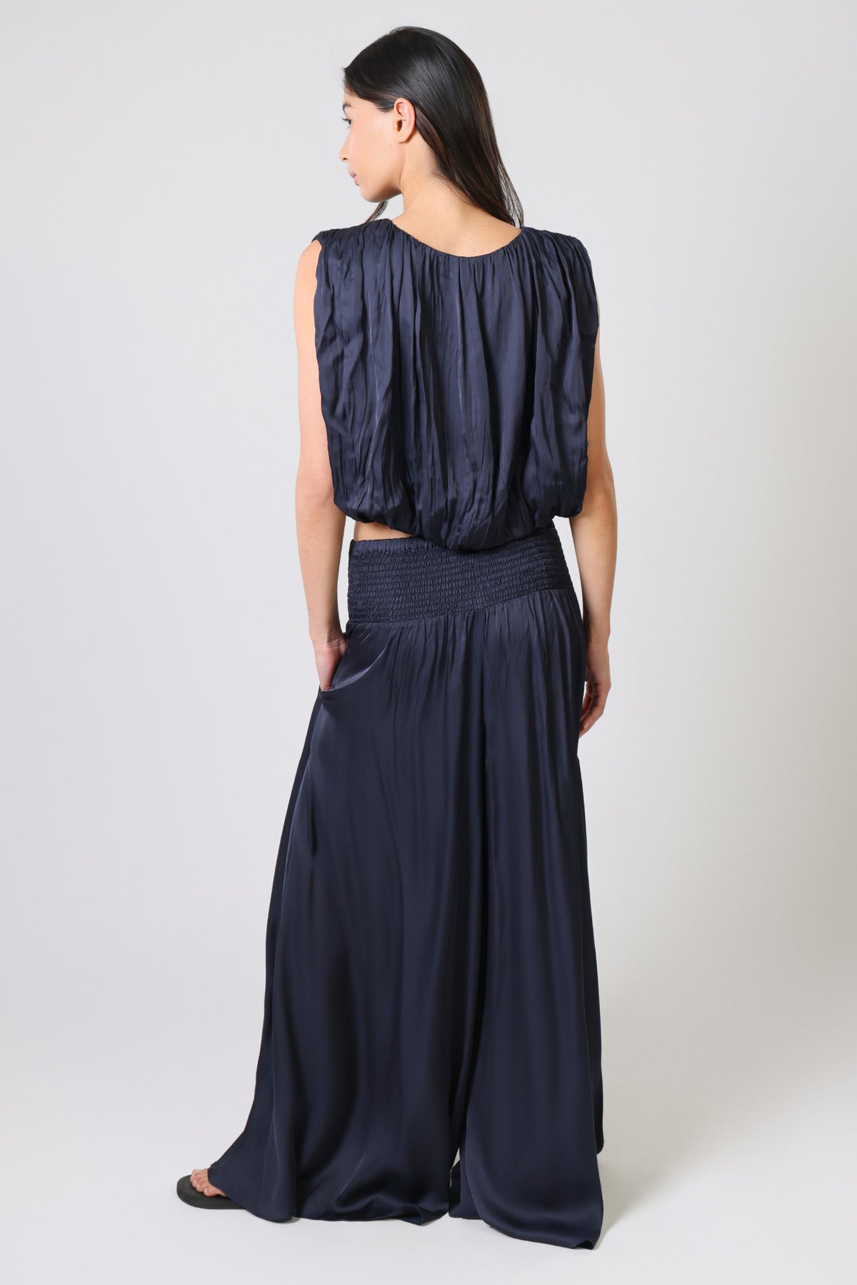 Free billowing trousers with an ultra-wide elastic waistband designed to sit low or high on the hip. Side seam pockets.