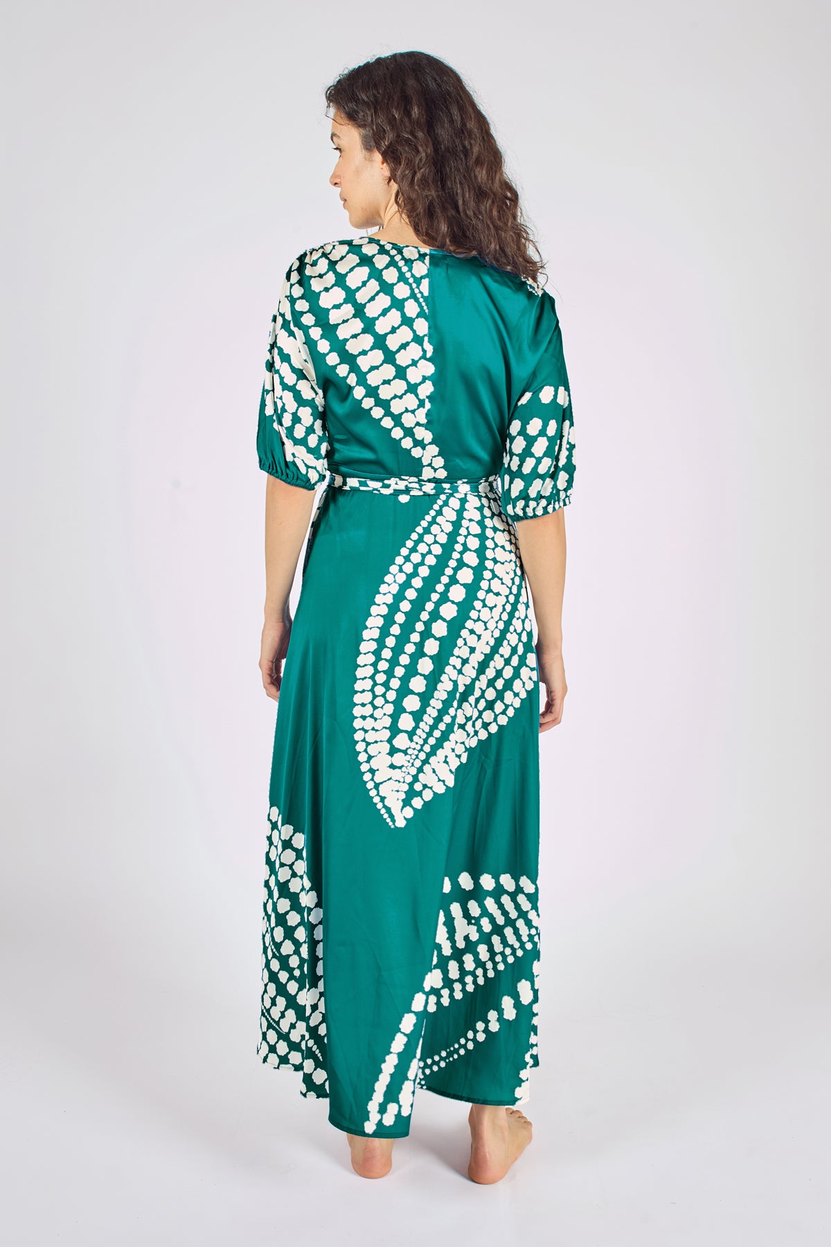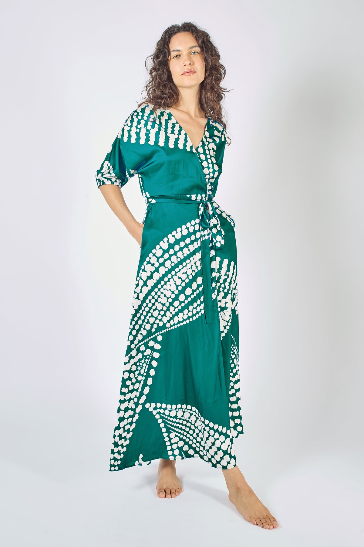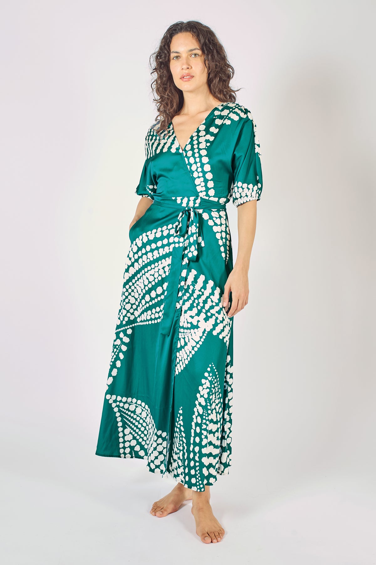 Beautiful wrap dress in silky blue with cream pattern. It has mid-length sleeves, side pockets and falls to your ankles.