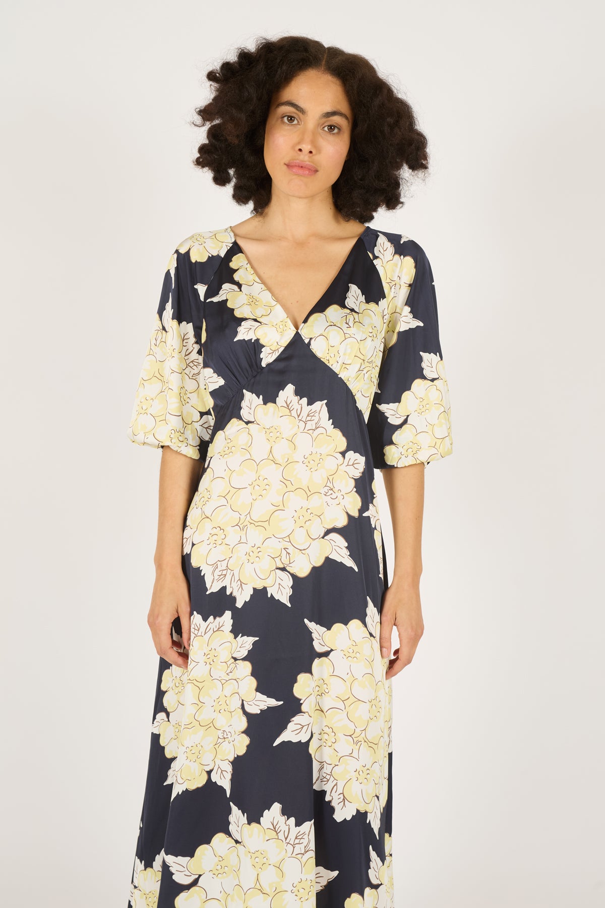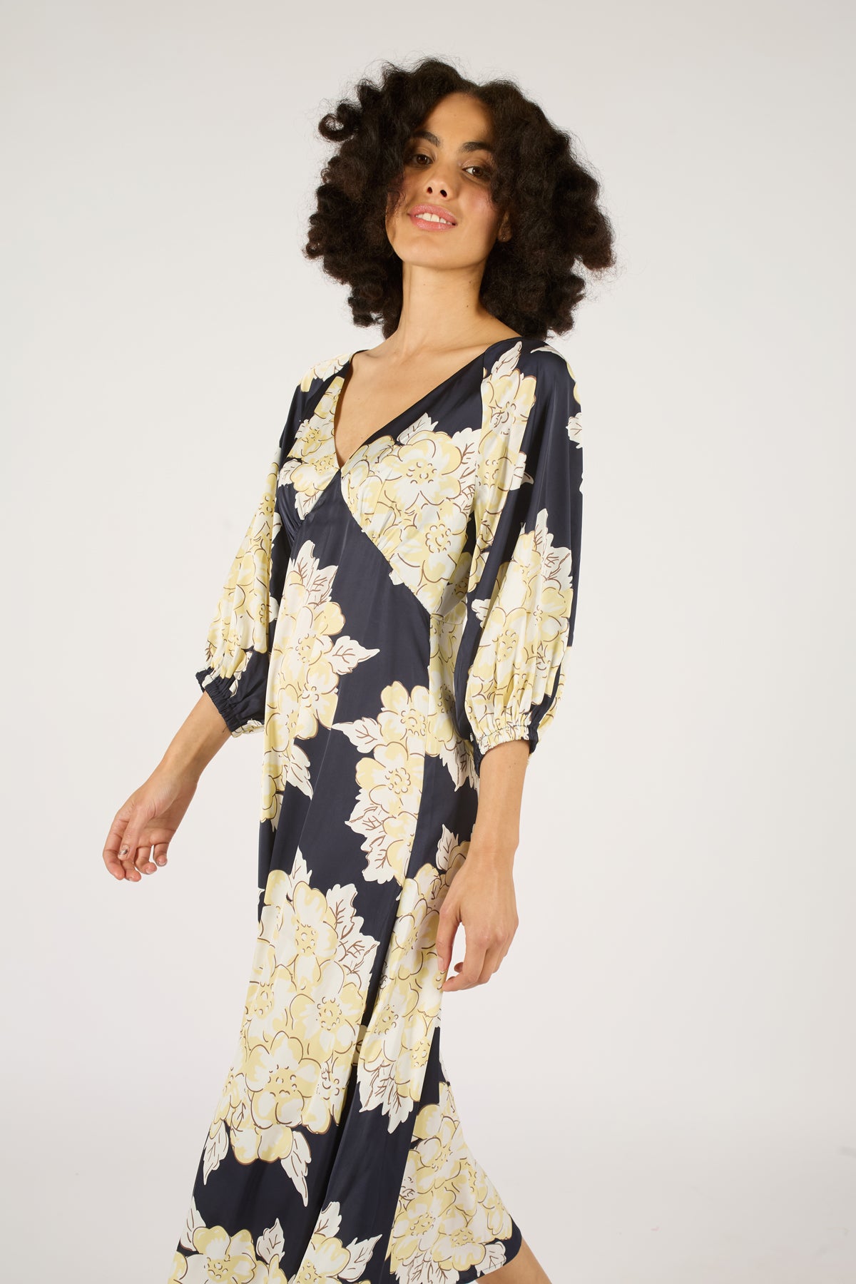 Midi dress with a deep V neck and empire waistline. With 3/4 sleeves with elasticated cuffs and back zip fastening. This beauty comes unlined allows the silky fabric in navy and cream to flow effortlessly.