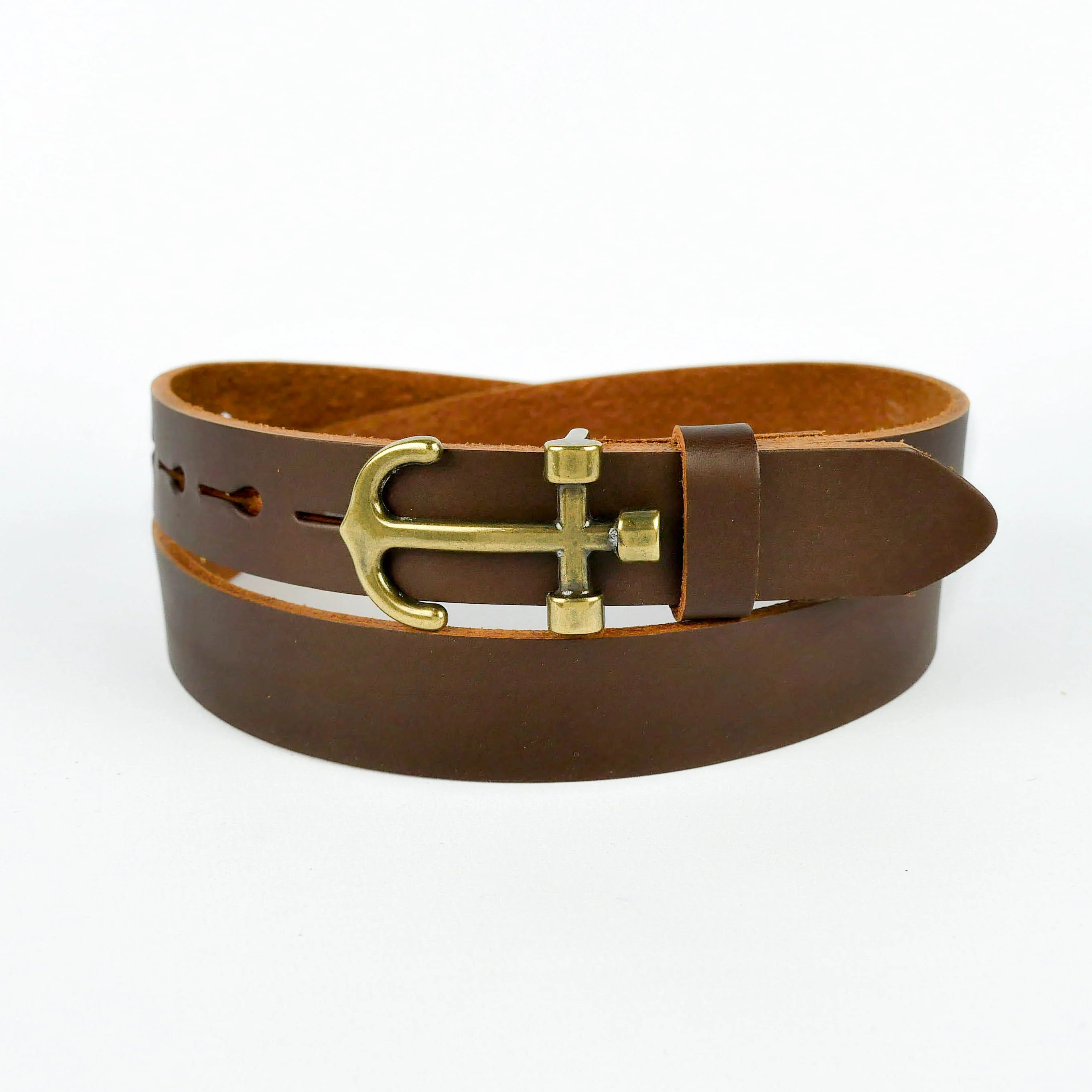 Add a touch of nautical chic to any outfit with the anchor buckle leather belt in brown.