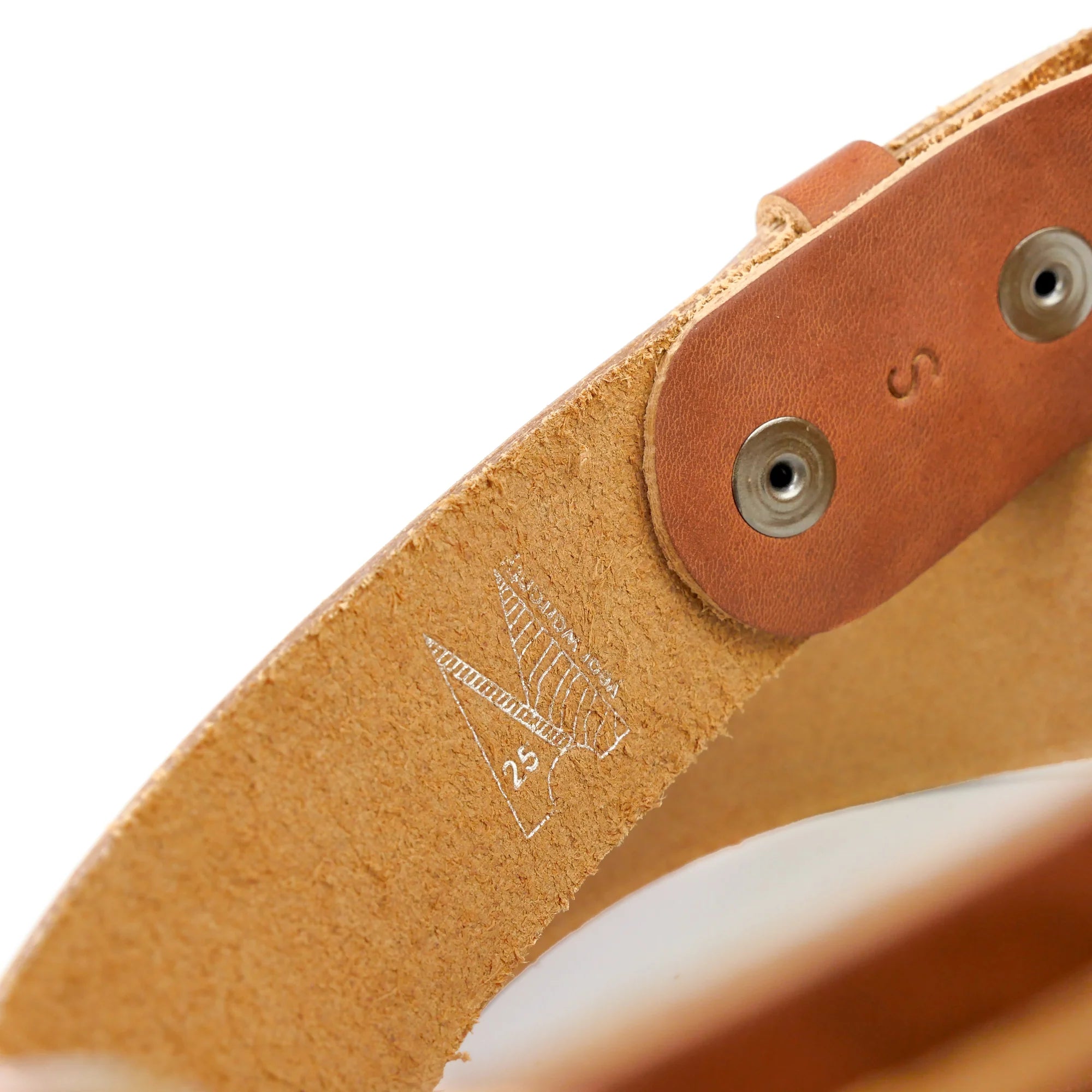 Proudly handmade in Village Leather's London Studio by a member of their small team, each belt features a subtle embossing of their makers' mark on the inside, authenticating its creation. Stamped crisply next to the logo, you'll notice the 25 year Warranty Snips - guaranteeing you a lifetimes worth of wear.